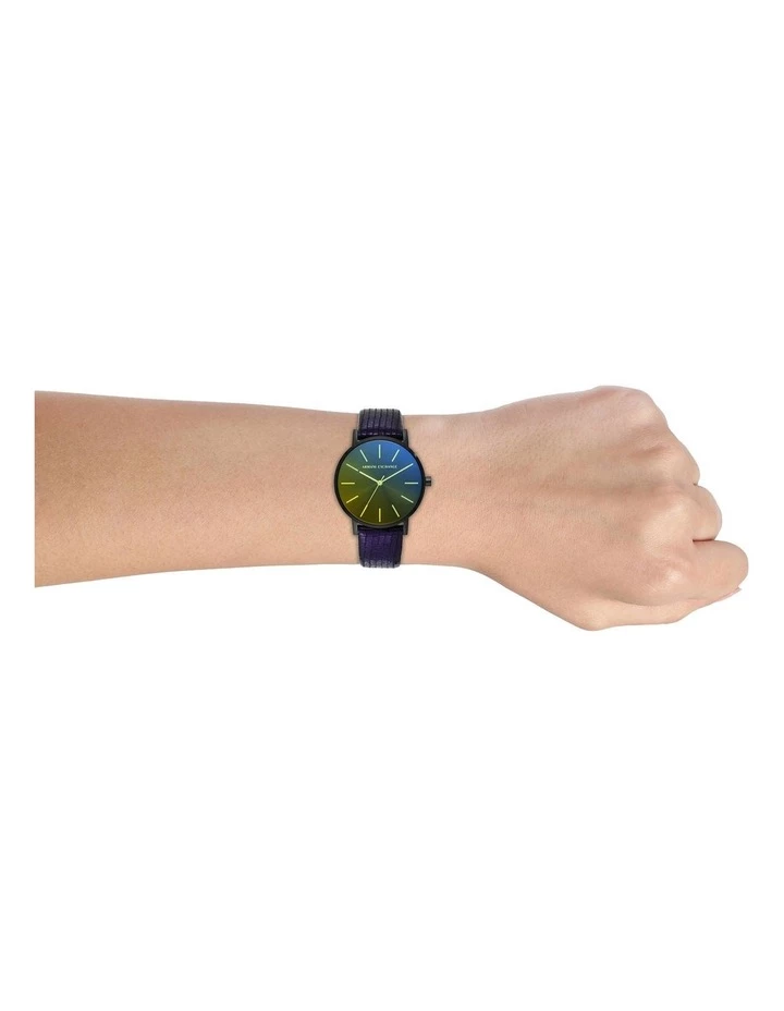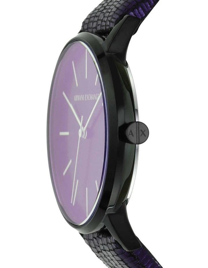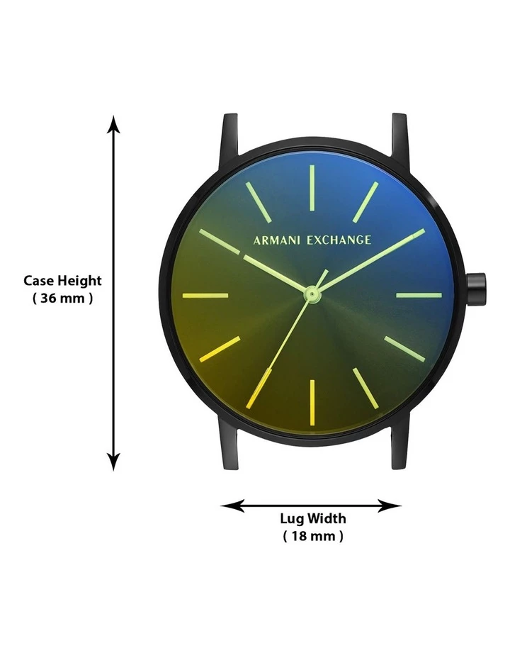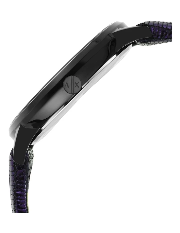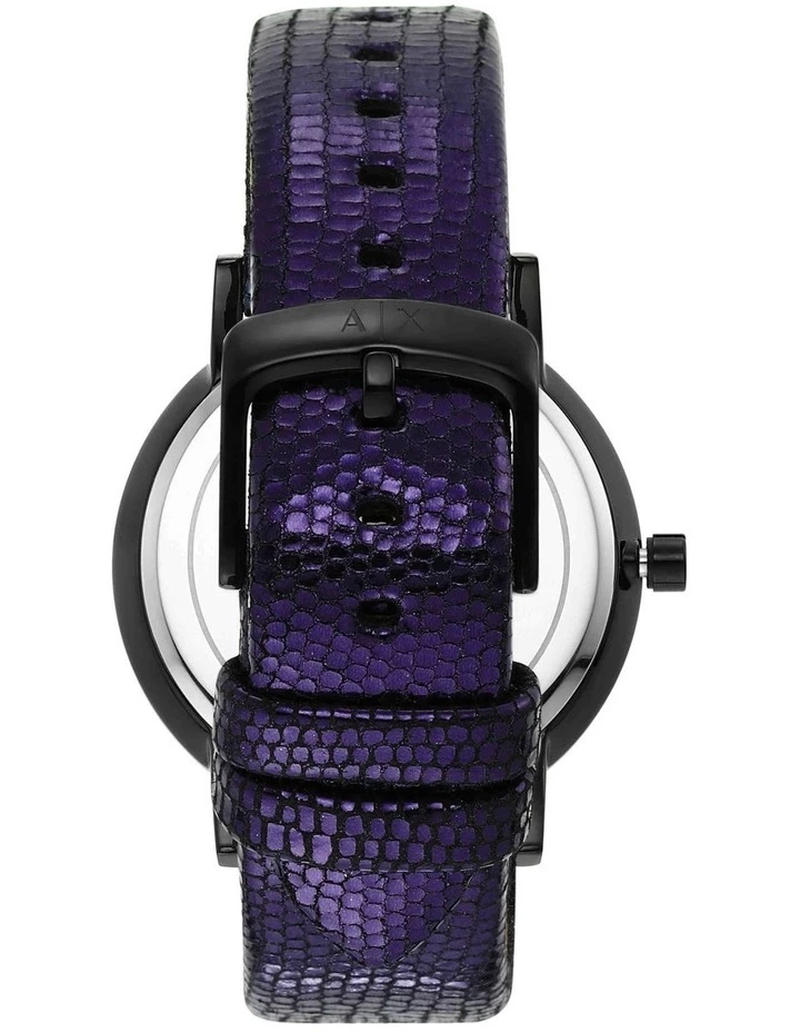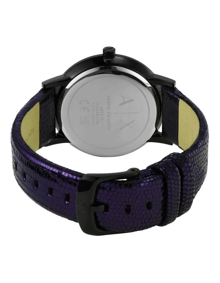 AX5576 Armani Exchange’s 36mm watch features a black sunray dial with stick indexes, iridescent crystal, three-hand movement and metallic blue leather strap.