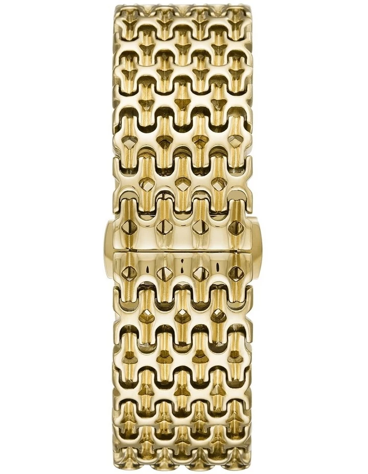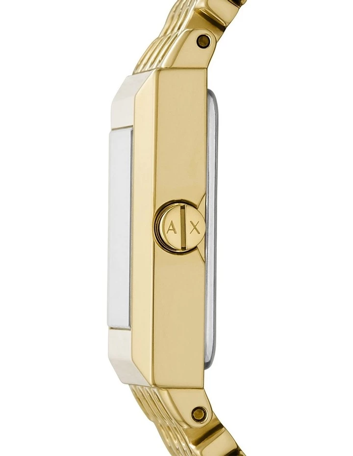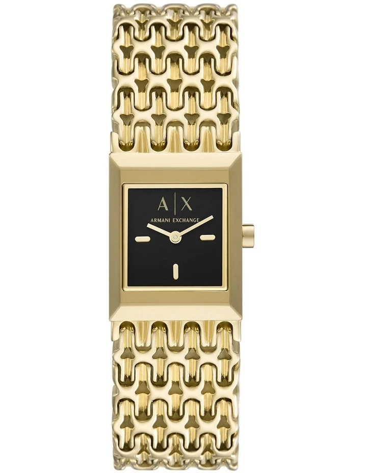 Decidedly modern yet retro adjacent, Sarena from Armani Exchange features an optical illusion inducing X link strainless steel bracelet inspired by the AX logo. The square-shaped matte black dial against the all gold-toned watch lends definition to the timepiece.