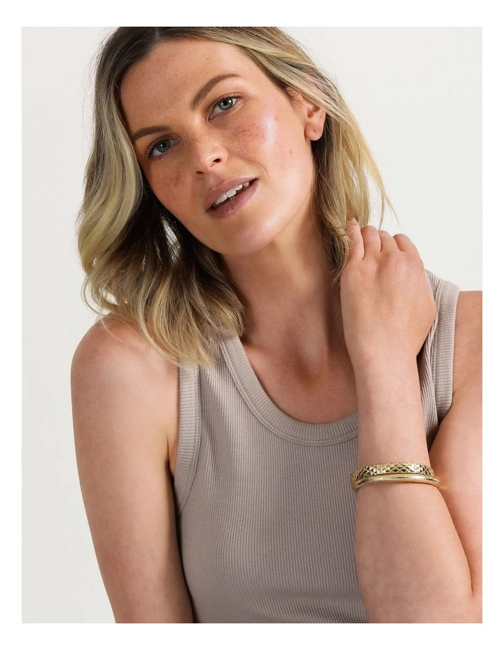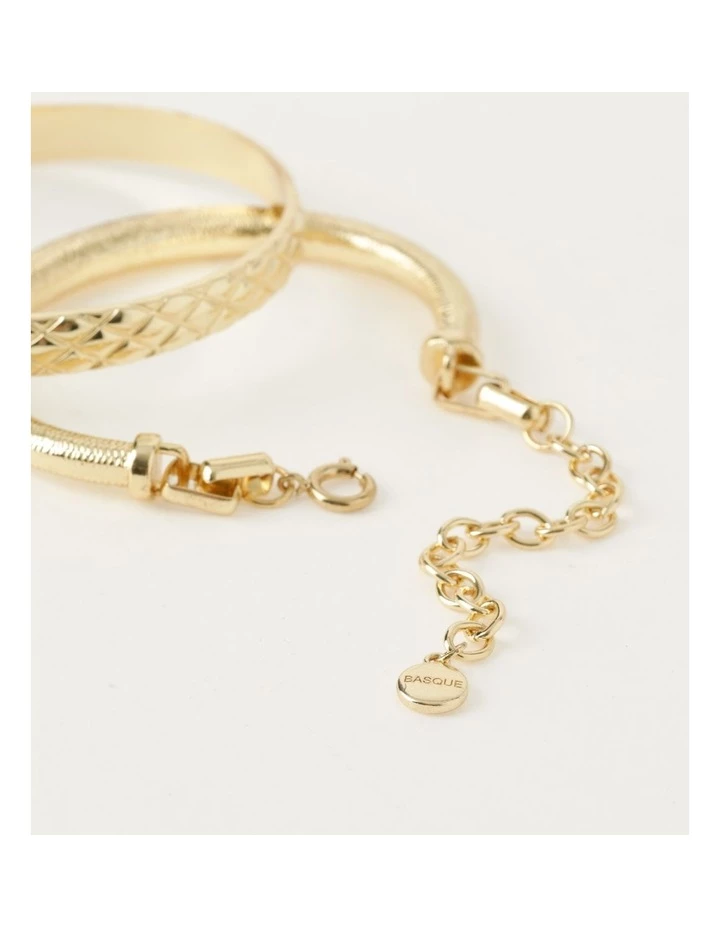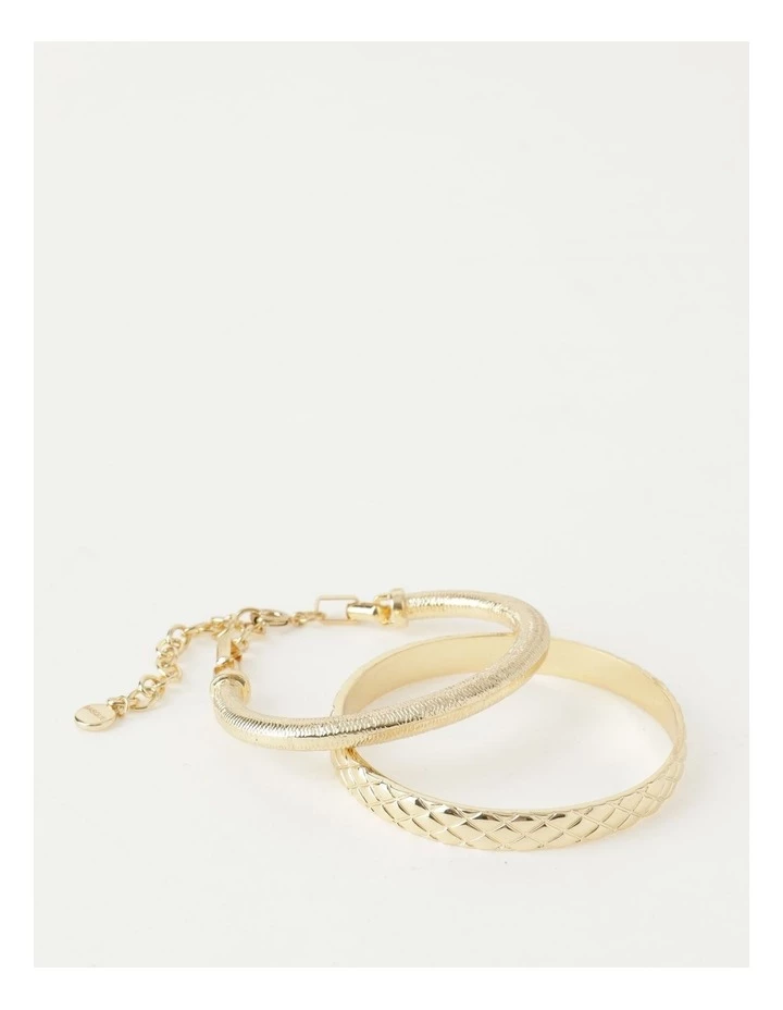 Elevate your look with a bracelet set. This set includes a smooth cuff and textured bangle in a gold-toned setting. Mix and match to your hearts content.