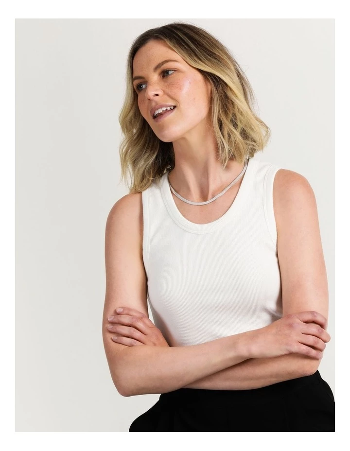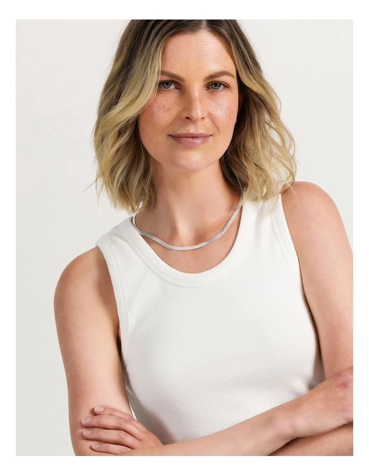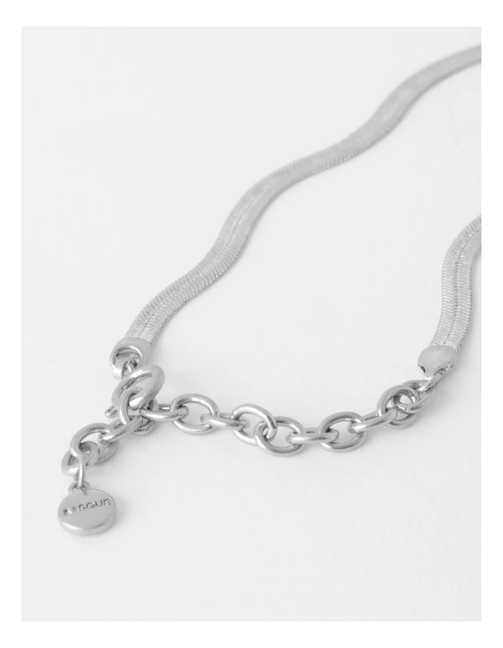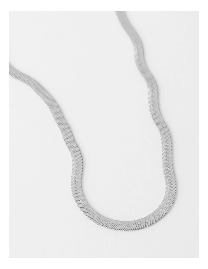Elevate your look with a fashion forward necklace. This necklace is silver-toned and has a flat snake chain design. Layer with your favourite silver jewellery for maximum impact.