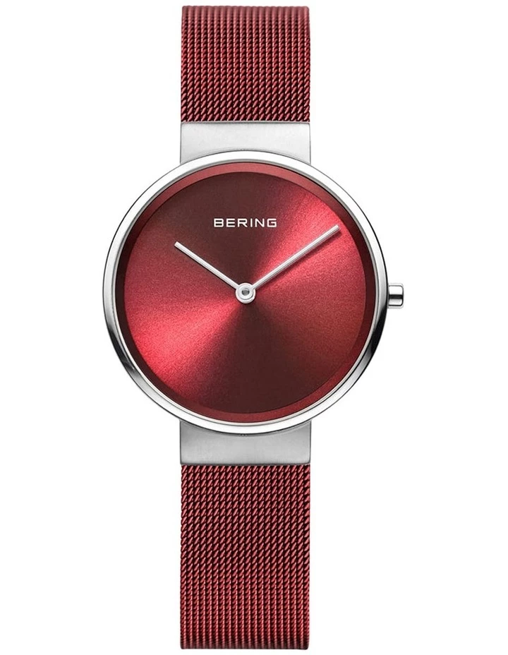 Collection:ClassicCategory:watchGender:femaleGlass type:flat sapphire crystalMovement type:quartzCase color:polished/brushed silverCase height:6 mmCase width:31 mmCase diameter:31 mmCase material:stainless steelStrap material:milaneseStrap color:redStrap width:14 mmClasp:safety claspDial color:redWater proofness:5 ATM