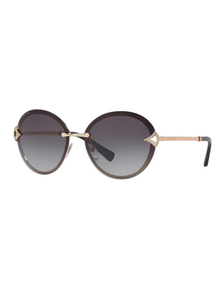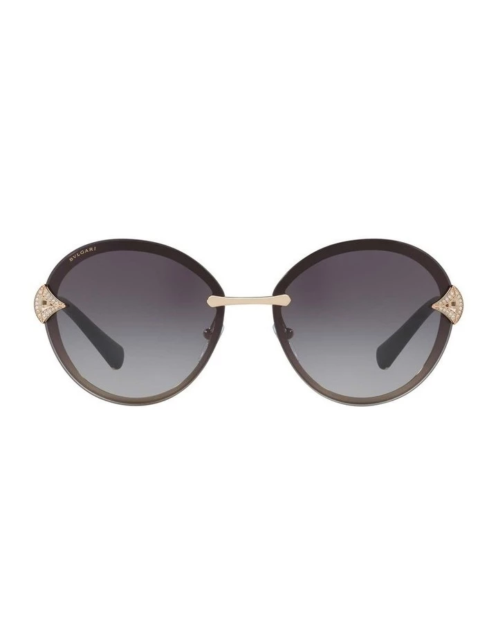Bvlgari oval gold metal sunglasses with light grey/dark blue gradient lenses. Come in a designer-stamped case.