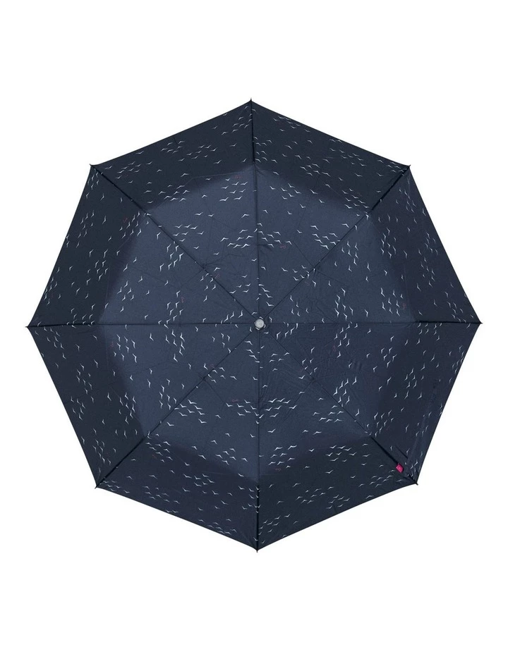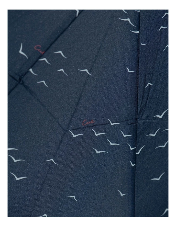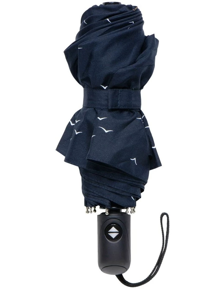 This portable umbrella features an exclusive cobalt crane print, auto open/close design and a storage case. Made by Shelta in China.