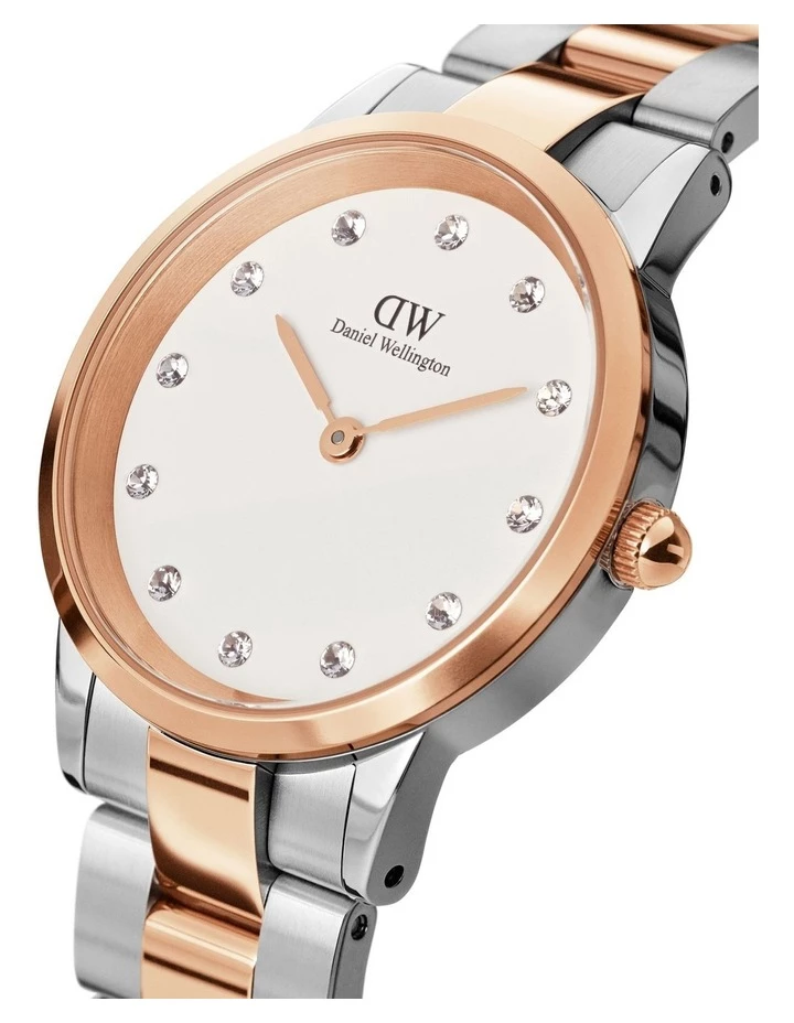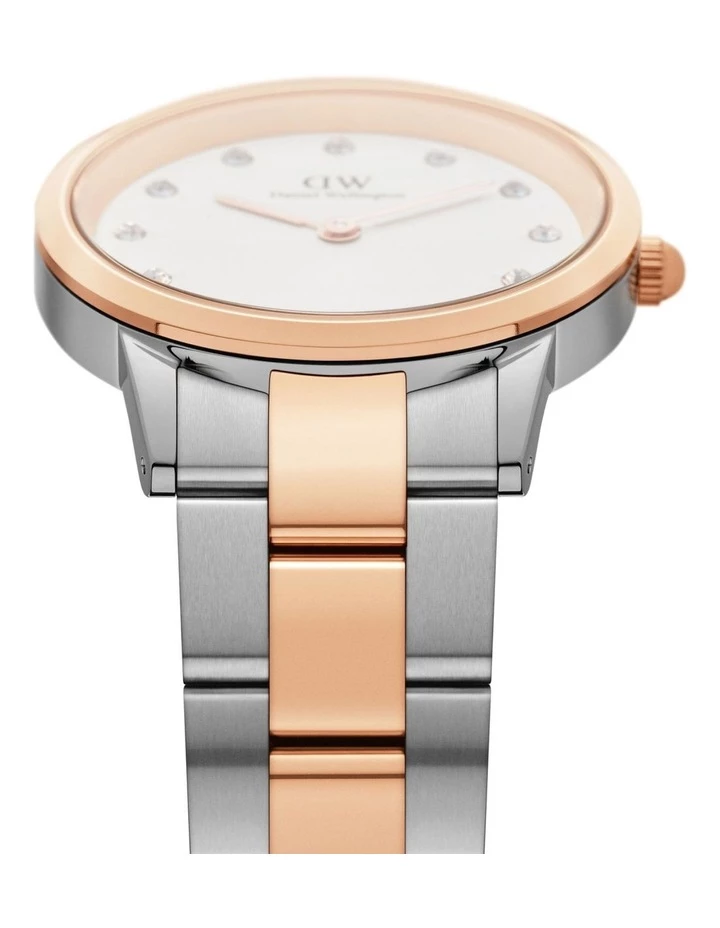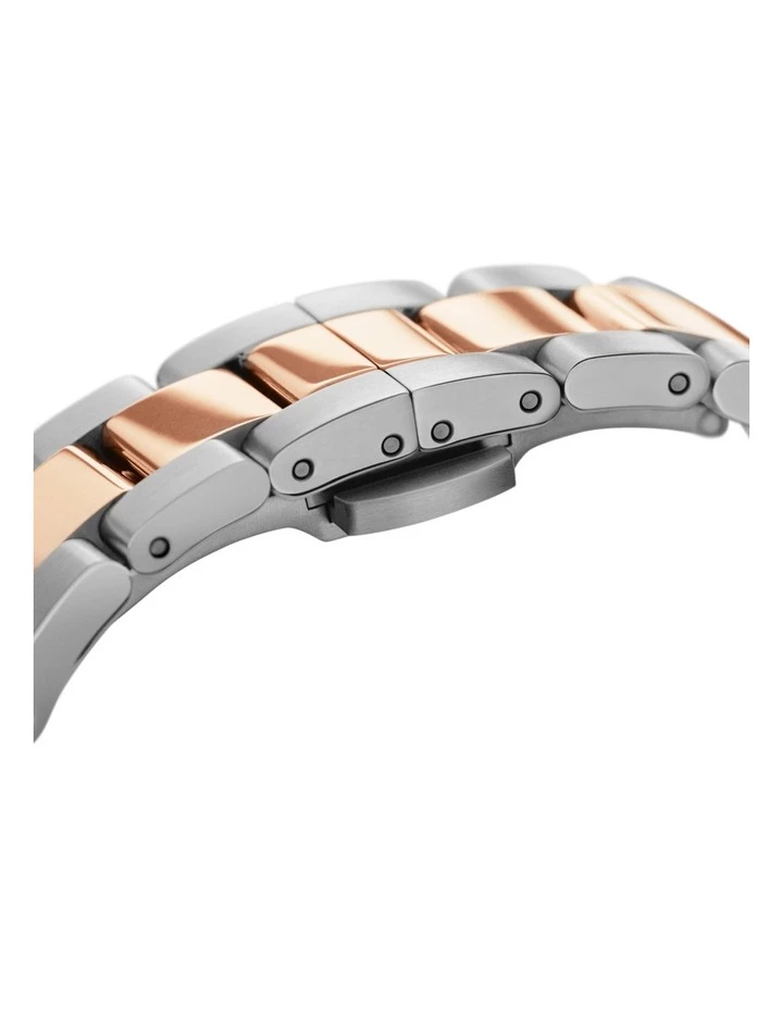 The Lumine features a bejeweled eggshell white dial with glistening Swarovski? crystals. This exclusive design gives our signature twelve index dial a renewed and luminous silhouette. To achieve the two-tone appearance, the Lumine comes in polished stainless steel with a vibrant silver finish with contrasting elements of the bracelet and case plated in refined rose gold. This unique combination gives the timepiece its elegant and graceful appearance.