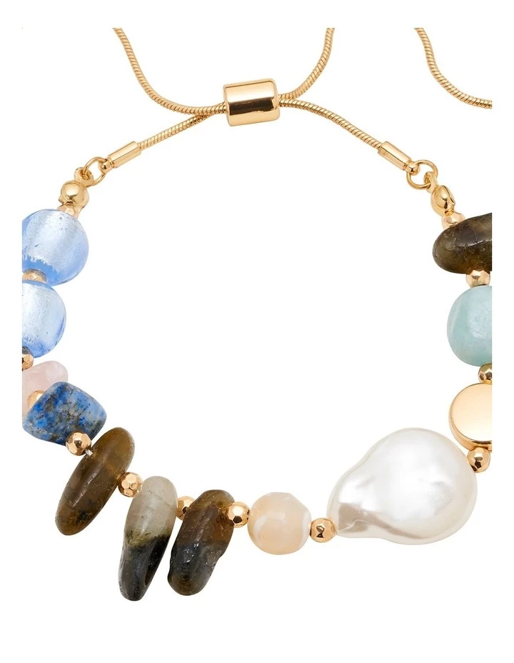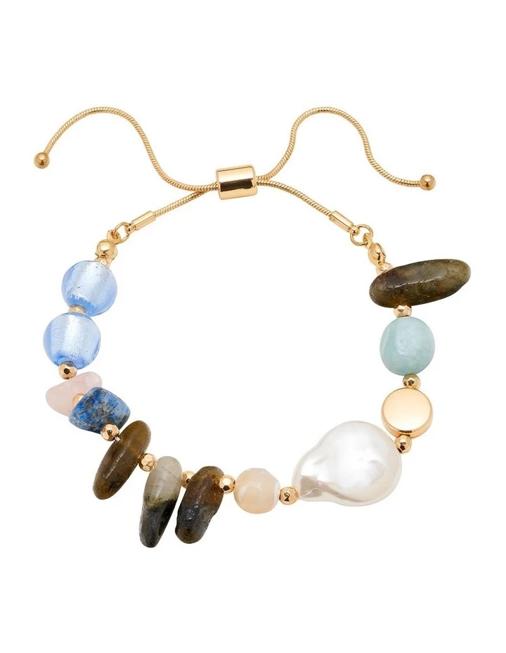 Australian brand David Lawrence has accompanied womenthrough their daily lives, offering timeless investment pieces fit to theoccasion. Bring gorgeous colour and unique character to your style with the Stoneand Pearl Feature Bracelet. This gorgeous slider bracelet features mixed bluestones, a glossy faux pearl accent, and gleaming gold-coloured plating.