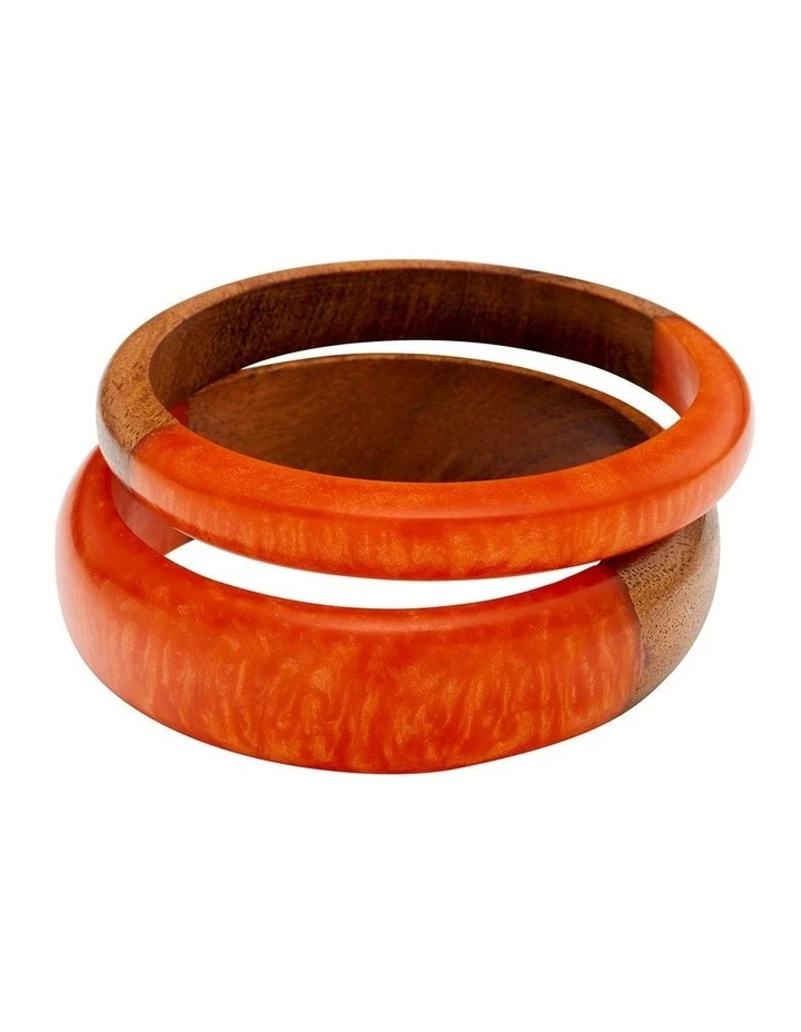 Australian brand David Lawrence has accompanied womenthrough their daily lives, offering timeless investment pieces fit to theoccasion. The Wood and Resin Bangle Set brings a bold finish to your favouritecasual looks, featuring the beauty of natural wood and eye-catchingcoral-coloured resin.