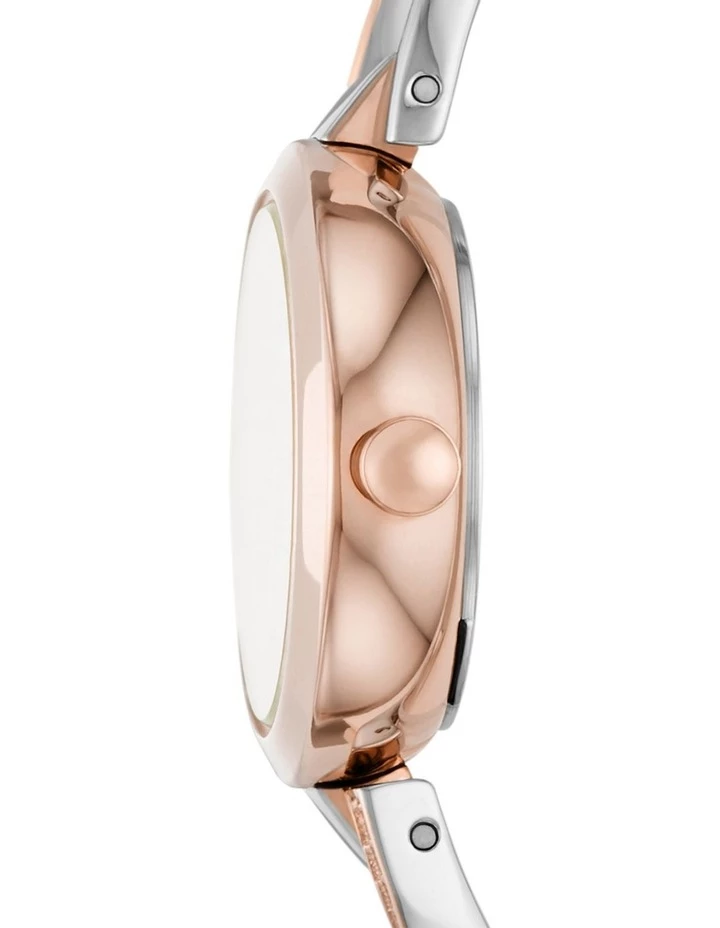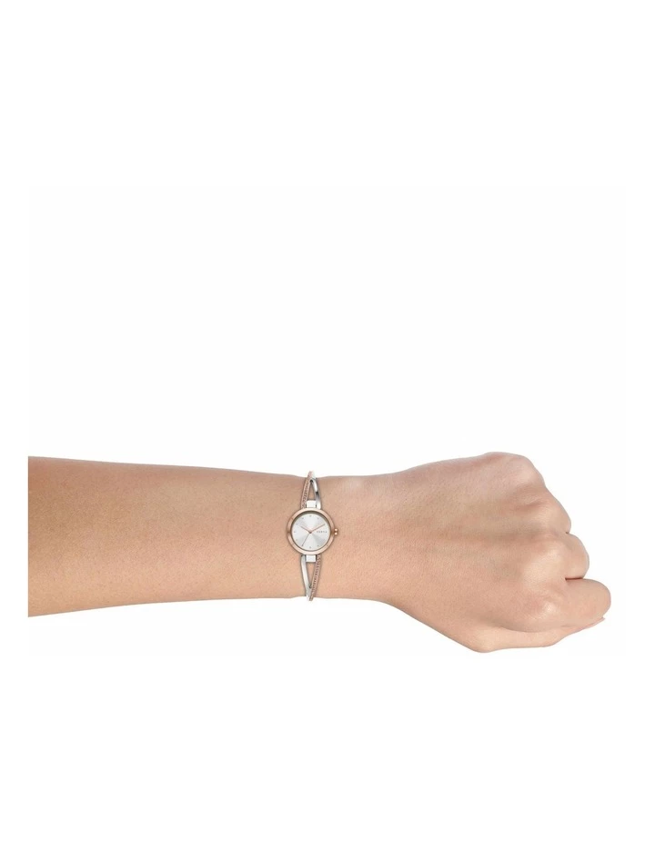 DKNY’s Crosswalk watch is a polished timepiece of rose gold-tone and silver-tone stainless steel in a sophisticated, slender silhouette. This 26mm dainty wristwatch features a silver sunray dial with clear glitz indices, three-hand movement and stainless-steel two-tone with tonal glitz cross over bangle.