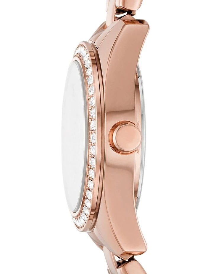 It’s back to the basics with this elegant timepiece. A monotone wonder, the Nolita by DKNY is a slick watch much like the city it draws inspiration from. This 26mm Nolita features a silver sunray dial with rose gold-tone numeral and stick indices, a pav glitz topring, three-hand movement and rose gold-tone stainless steel bracelet.