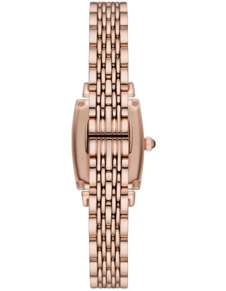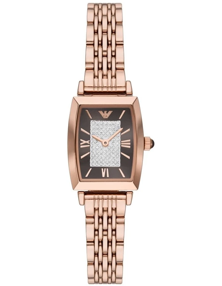 AR11407 Emporio Armani’s 26mm watch features a brown sunray dial, rose gold stick indexes, two-hand movement and rose gold-tone stainless steel bracelet.