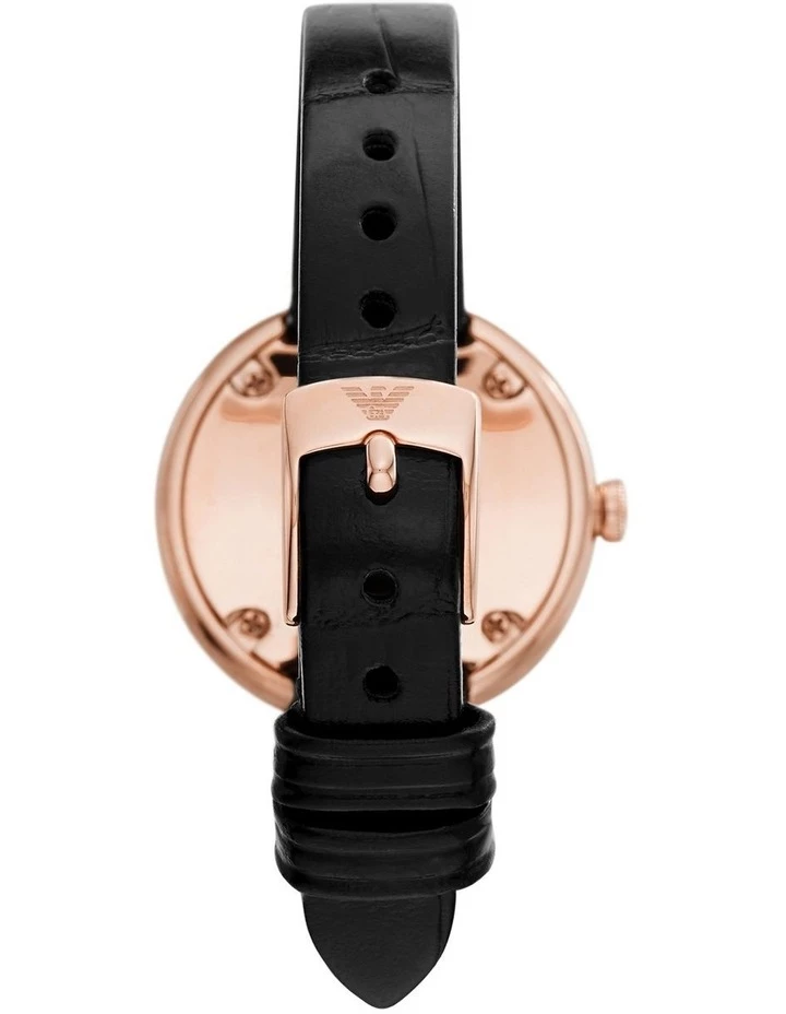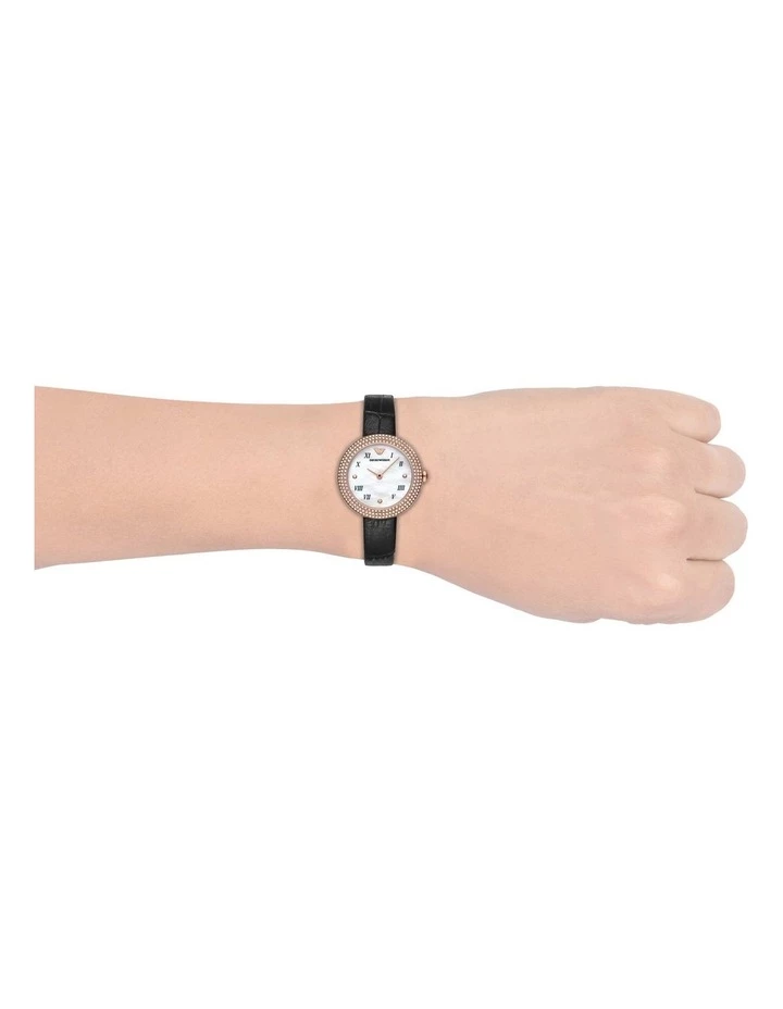 A timepiece with a touch of whimsy and wonder, Rosa brings together various textures to create a visual symphony of black, white and rose gold. A white mother-of-pearl dial with black Roman numeral and glitz dot indexes creates a focal point that is enhanced by a crystal-studded rose gold-toned bezel. It’s rose gold-toned two hands and black Croco leather strap completes its look.