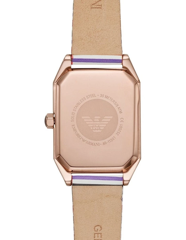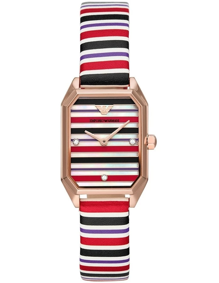 Considerably adding to your elegance, this women’s analog watch is a beautiful play of color. This ladies’ Gioia collection from the House of Emporio Armani watch adds elegance to any outfit with a polished rose-gold-tone rectangular case it takes up a notch. It features a multicolor striped dial with rose gold-tone dot indexes, two-hand movement and multicolor striped leather strap completes the look. This timeless rectangular analog masterpiece is oozing perfection and will look strongly elegant on your wrist.