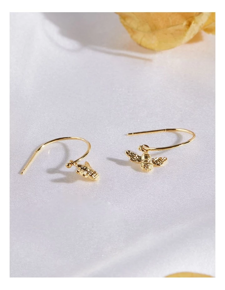 These delicate gold plated drop hoop earrings, with a sweet bee charm, are a simple but beautiful addition to any outfit.