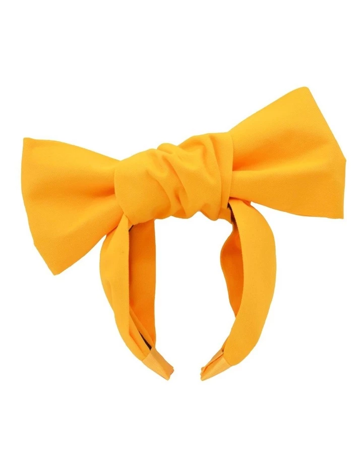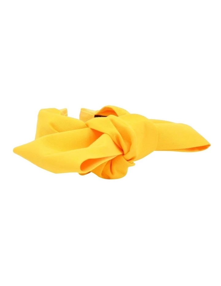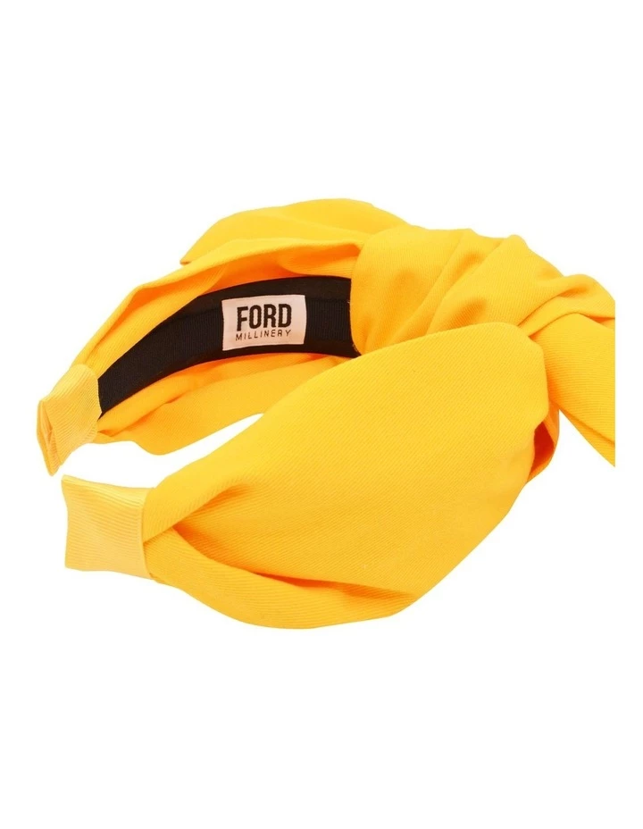Be the talk of the town with PALOMA, an expertly hand-crafted headpiece mounted upon a thick headband. This statement yellow fascinator features an oversized, femme bow with slightly ruched details. Add a bright pop to your look this Spring Racing with this stunner.