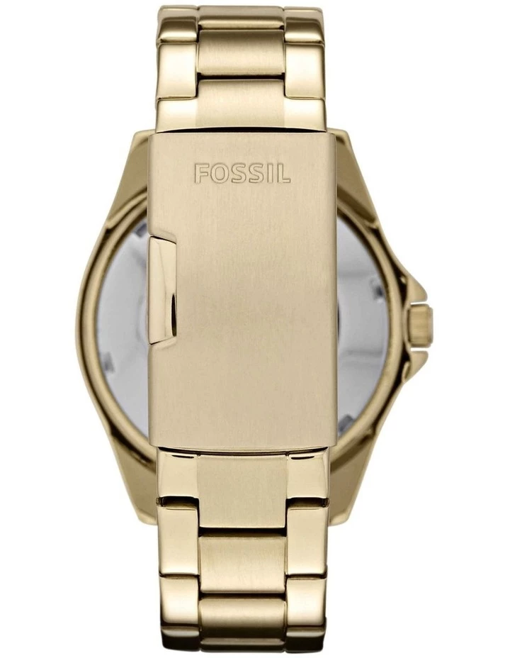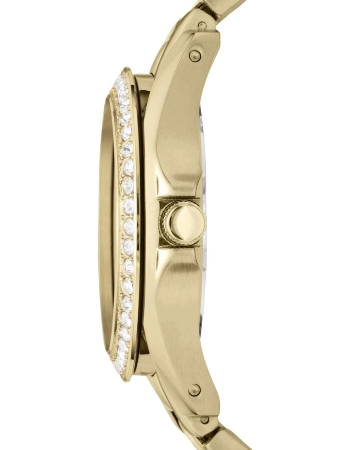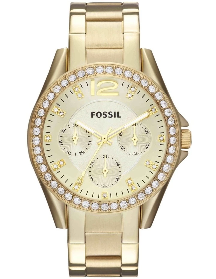 ES3203 Looking for a statement piece that would go well with any outfit? Then this women’s Riley watch from the house of Fossil is surely your best catch. The champagne finish multifunction dial with crystals embellished top ring, makes it a captivating piece. This watch is encased in a gold stainless steel case with a gold three-link bracelet which complete the look.