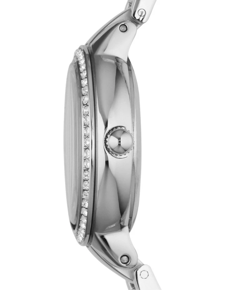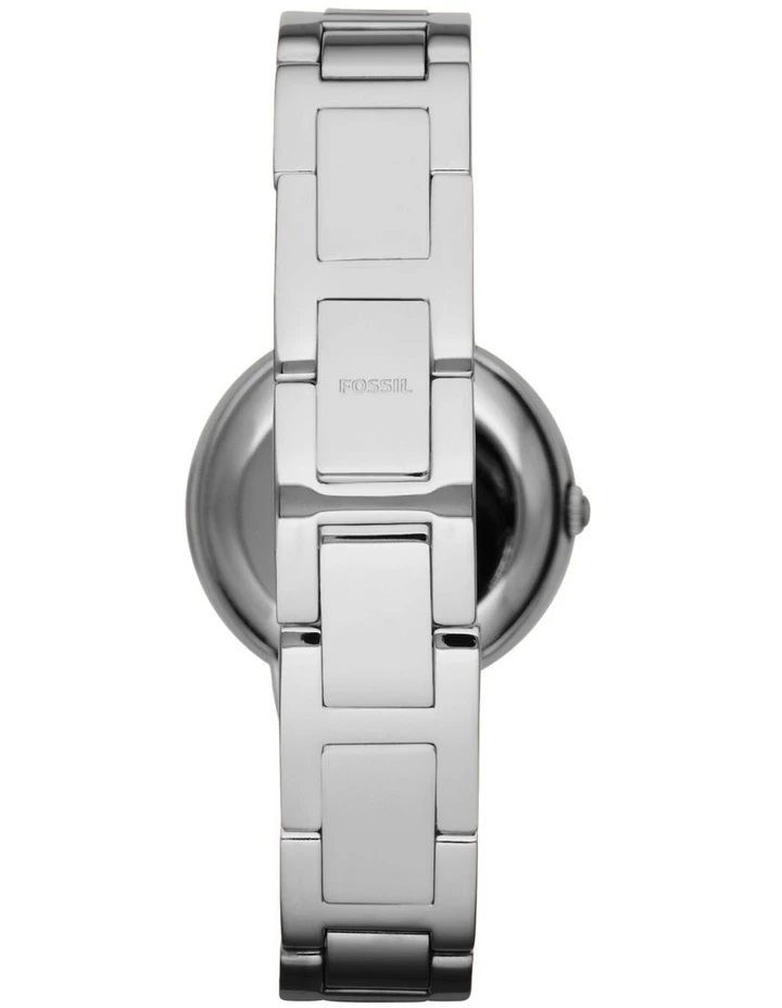 This Virgina silver watch for women by Fossil consists of a silver analog dial with three silver-toned hands and crystallized hour markers. It is attached to a silver stainless steel bracelet, secured using a jewellery clasp, and with crystal embellishments all over which form the major highlight of the piece. The dial is encased in a silver stainless steel case which again has a fixed crystallized bezel which will further add glam to your look.