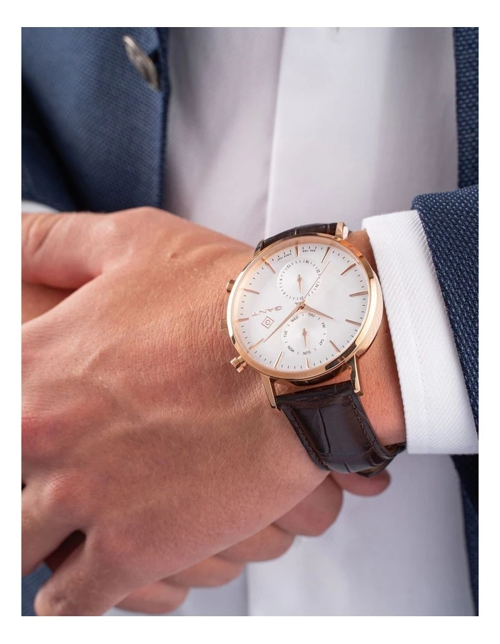 Sporty and classic, our men’s time collection combines innovation with superior craftsmanship to create keepsakes inspired by our Never Stop Learning credo. The Park Hill Day-Date II Wristwatch is made in stainless steel with a brown leather bracelet and features three hands and a date function.
