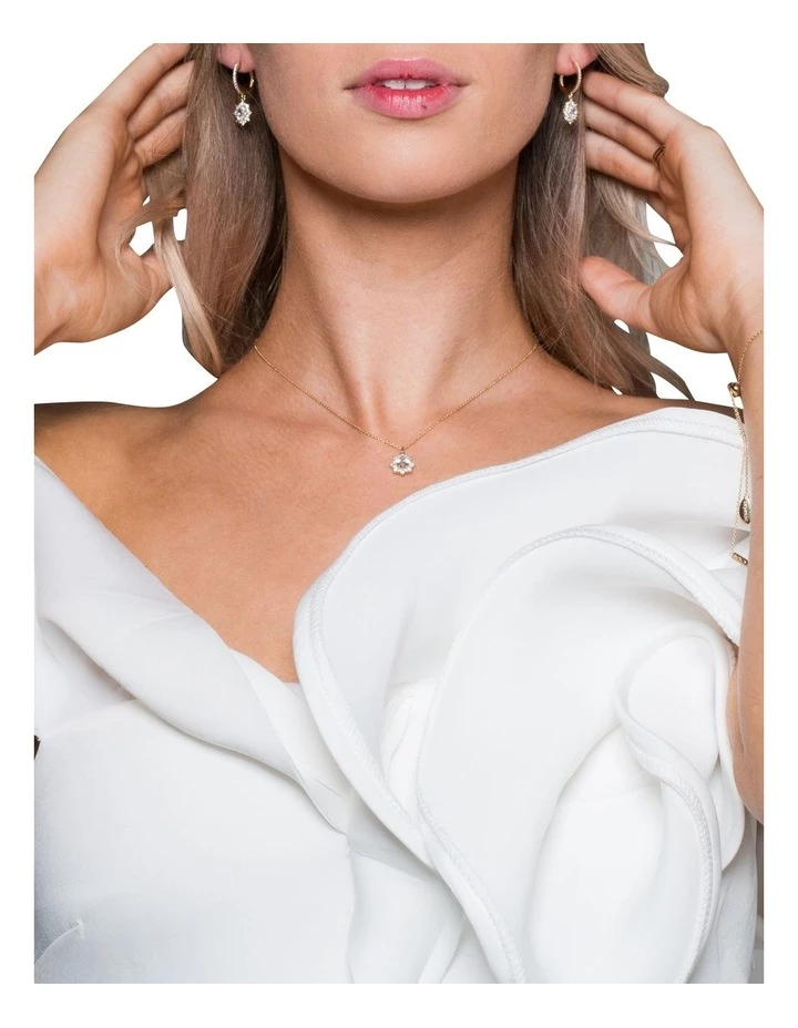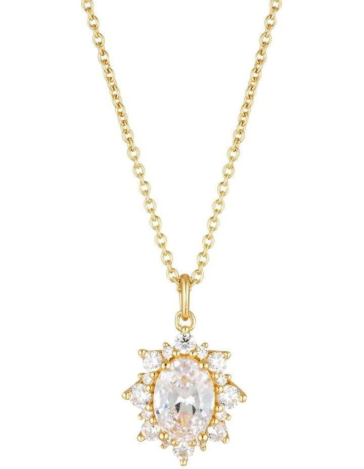 The Eloise pendant by Georgini blossoms with romance. Framed with a halo of petite shine this pendant is a new take on classic Georgini Bridal elegance. Pair with the Eloise Earrings for the perfect Bridal set. Crafted in 18ct Gold plated 925 Sterling Silver the pendant is set on a 41cm chain with a 5cm extension and measures approximately 16.5mm long by 11mm wide.
