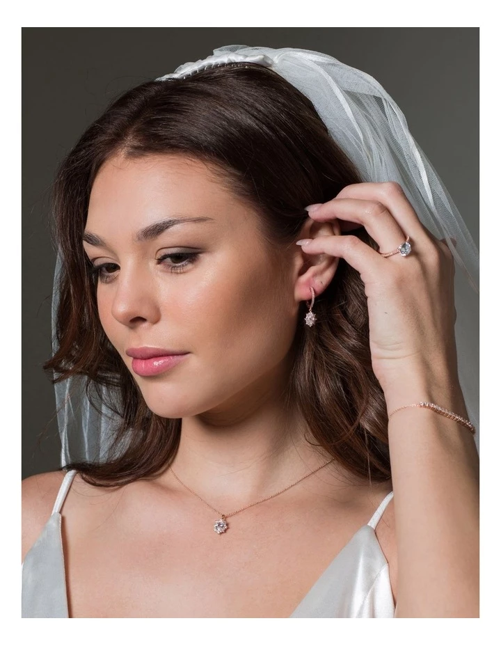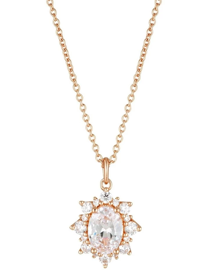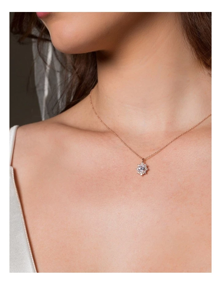 The Eloise pendant by Georgini blossoms with romance. Framed with a halo of petite shine this pendant is a new take on classic Georgini Bridal elegance. Pair with the Eloise Earrings for the perfect Bridal set. Crafted in 18ct Rose Gold plated 925 Sterling Silver the pendant is set on a 41cm chain with a 5cm extension and measures approximately 16.5mm long by 11mm wide.