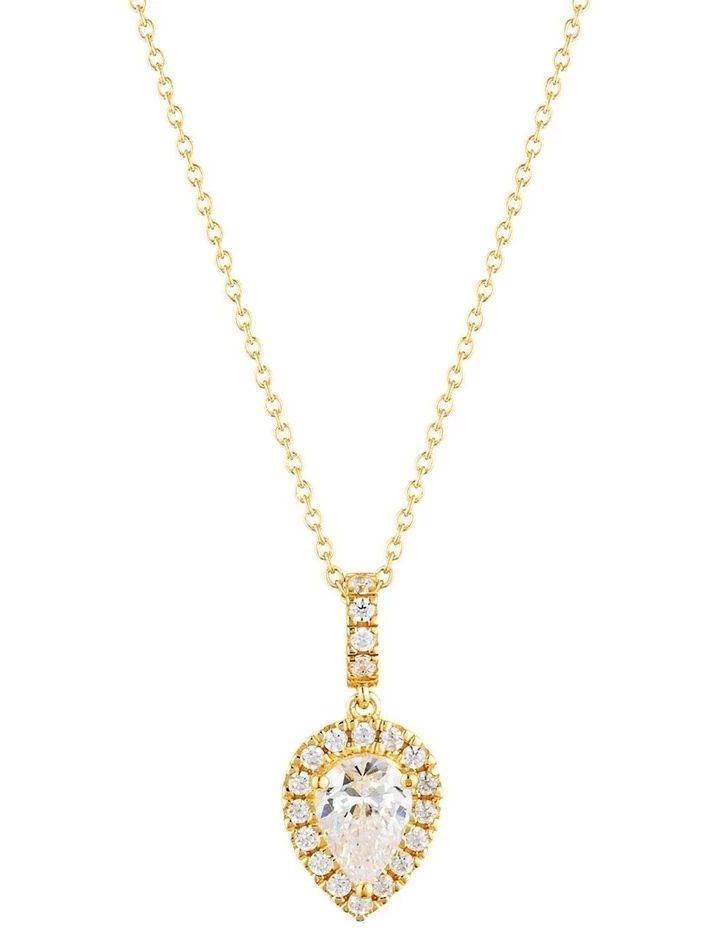 Simple and stylish the Splendore Pendant is your go to for everyday sparkle. Featuring a classic halo pear design this Pendant combines with the Splendore earrings and ring to make everday elegance easy. Crafted from Gold Plated 925 Sterling Silver and 0.75 ct. tw of Cubic Zirconia. Measures approx: 15.60mm