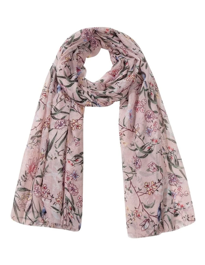 A classic floral print scarf in soft pink prints featuring wildflowers,