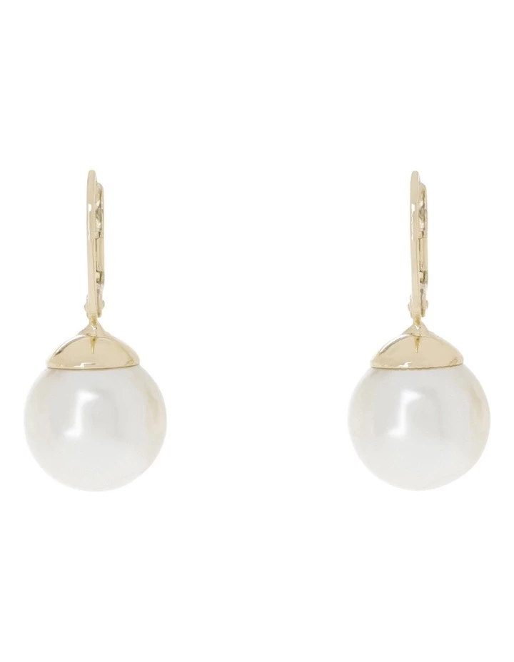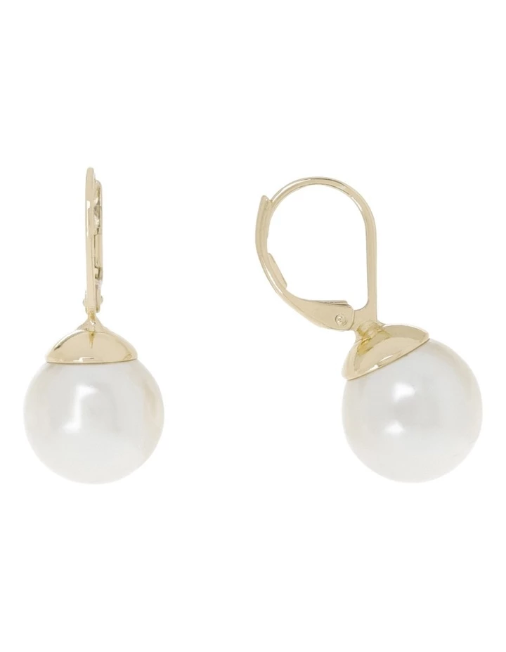 French Hook Faux Pearl Earring. A round 12 mm faux pearl hangs from a gold lever back closure. GJEL008M.