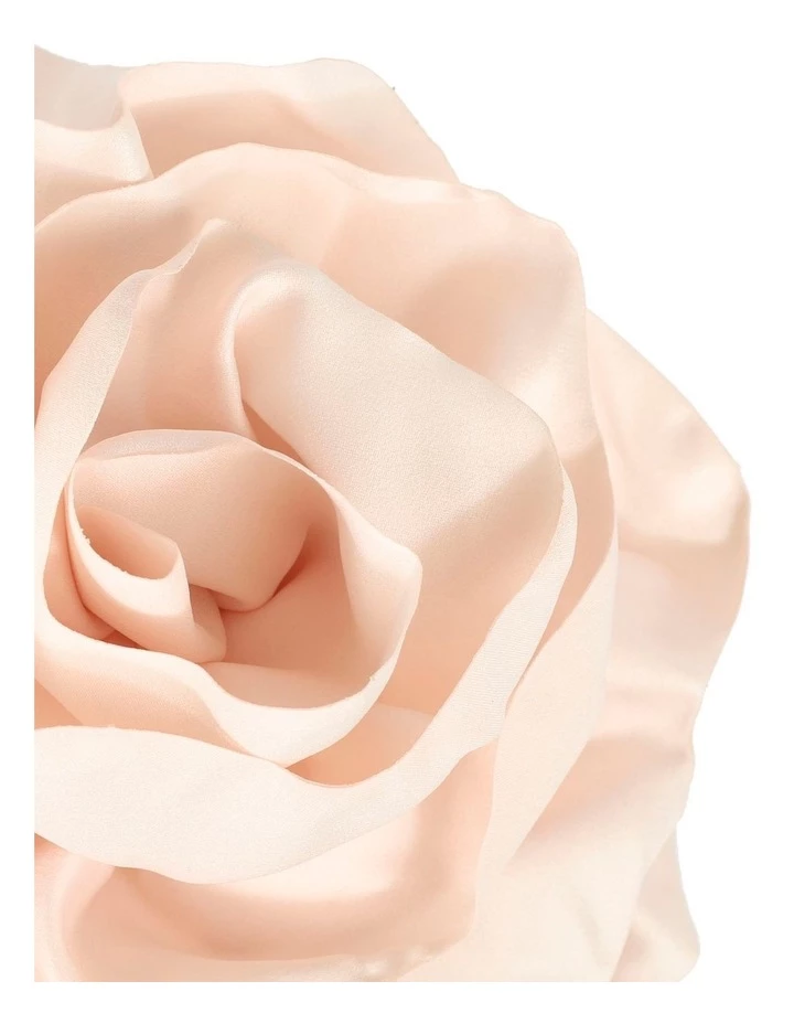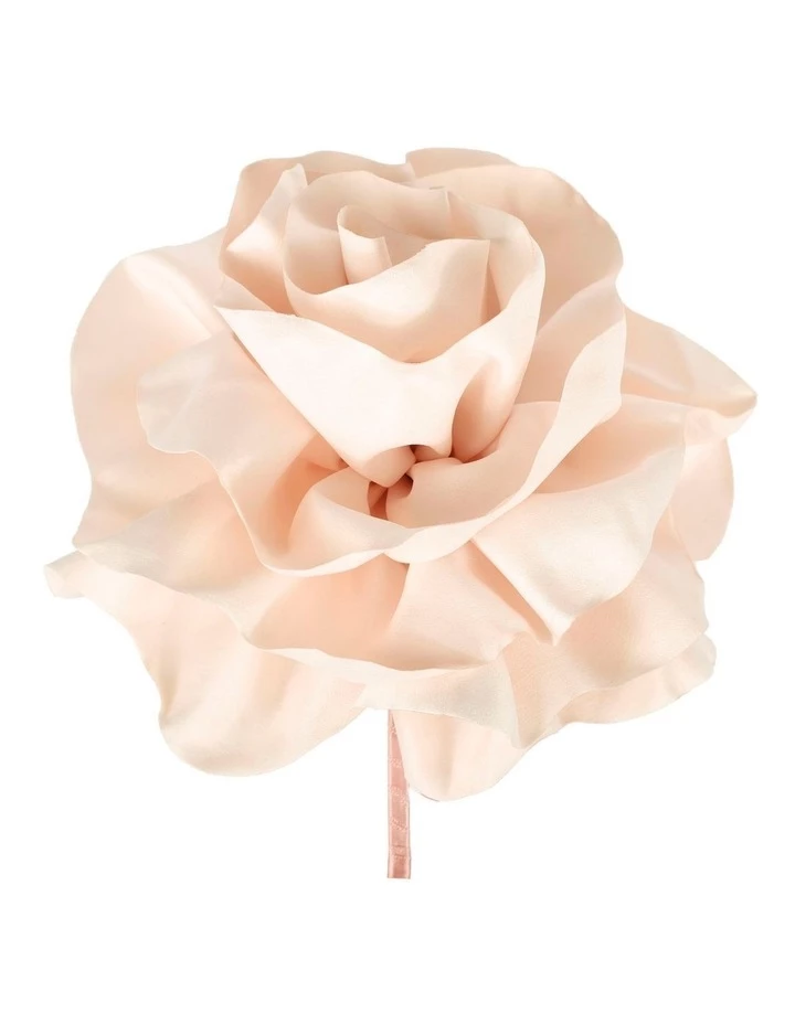 Soft matt finish fabric with a gentle scalloped edge is gathered to form a large flower shape. The flower shape is attached to a narrow headband and sits to one side of the head.