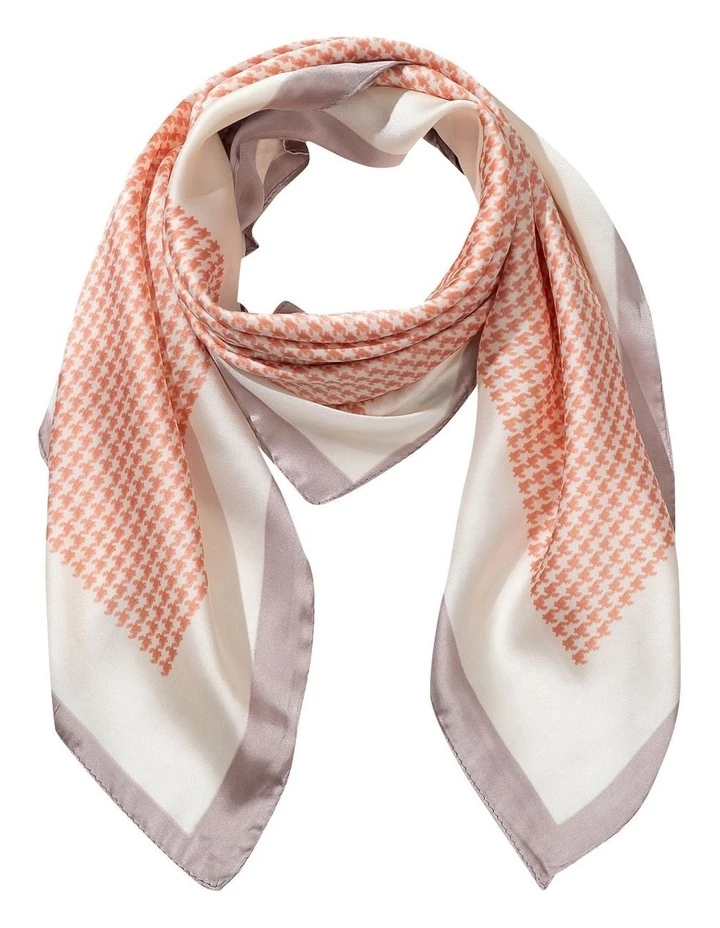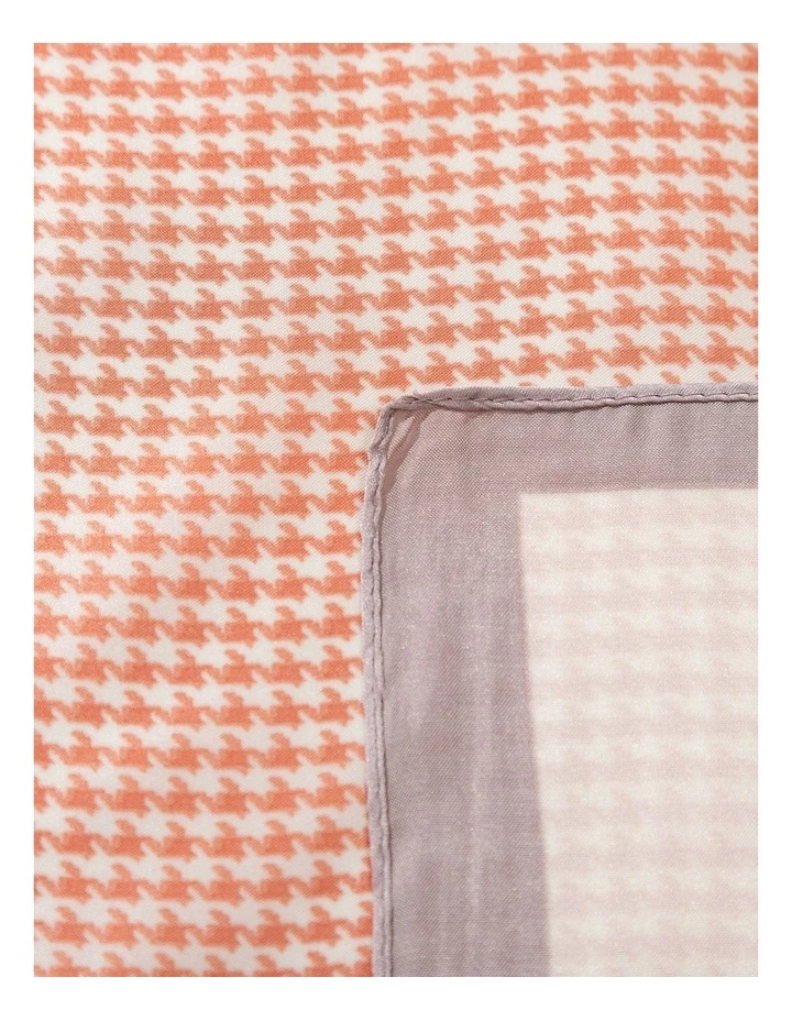 A classic hounds tooth print neckerchief in blush with a grey border on an ivory base cloth. The perfect finishing touch to your look.