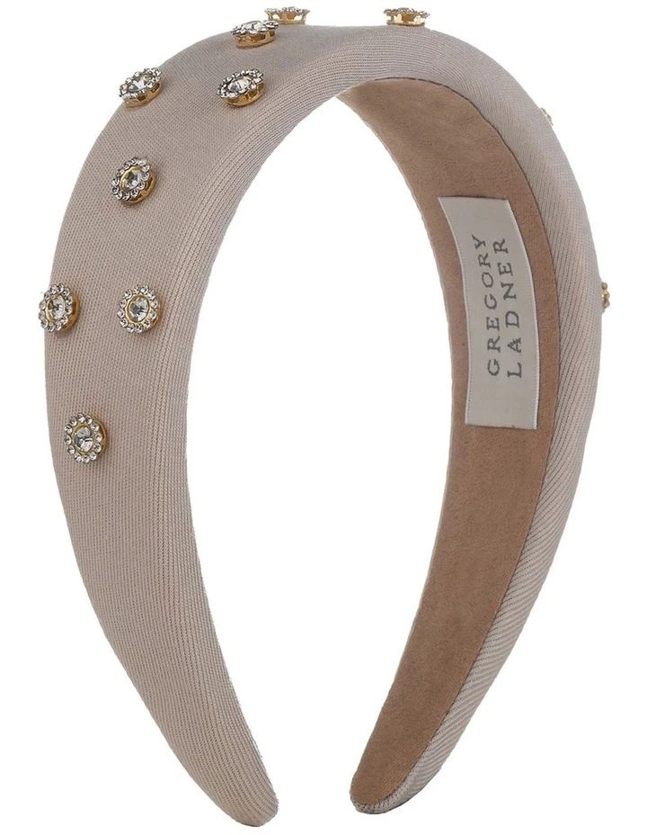 Add a touch of sparkle to your look with a wide padded headband featuring small jeweled flowers. The perfect addition to your accessory wardrobe.