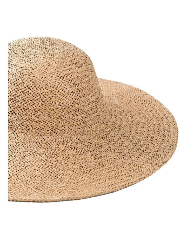 A Large brim basket weave woven hat in a natural colours. Perfect for the beach or laying beside the pool.
