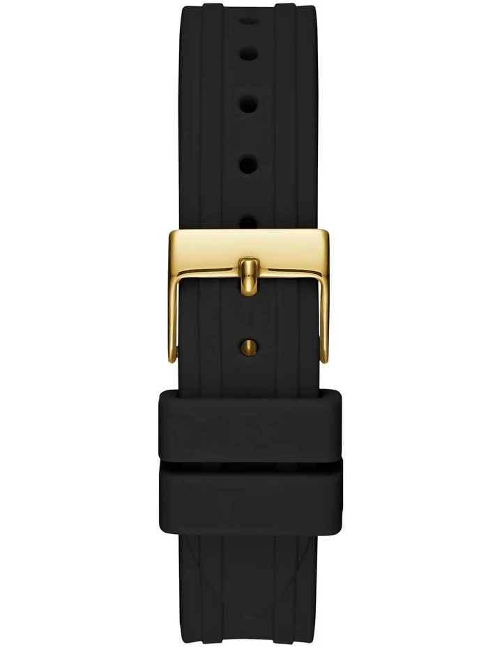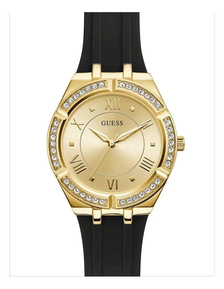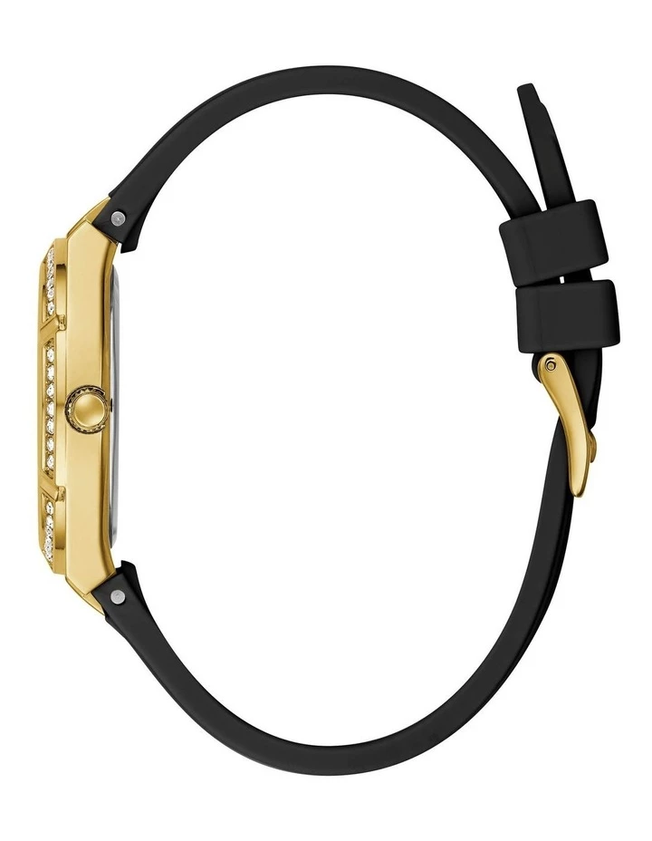Classically modern this Guess watch features a gold tone crystal embellished case and black silicone strap.