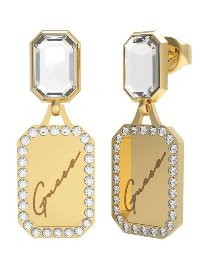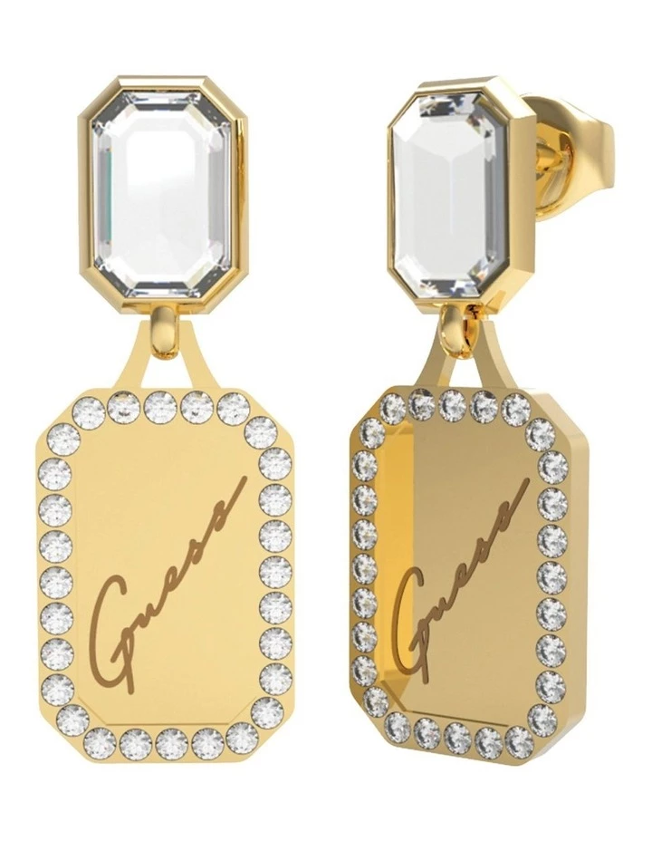Stylishly on trend, the GUESS Jewellery Tag earrings from the Crystal Tag collection in yellow gold tone features a tag pendant with crystal embellishments.