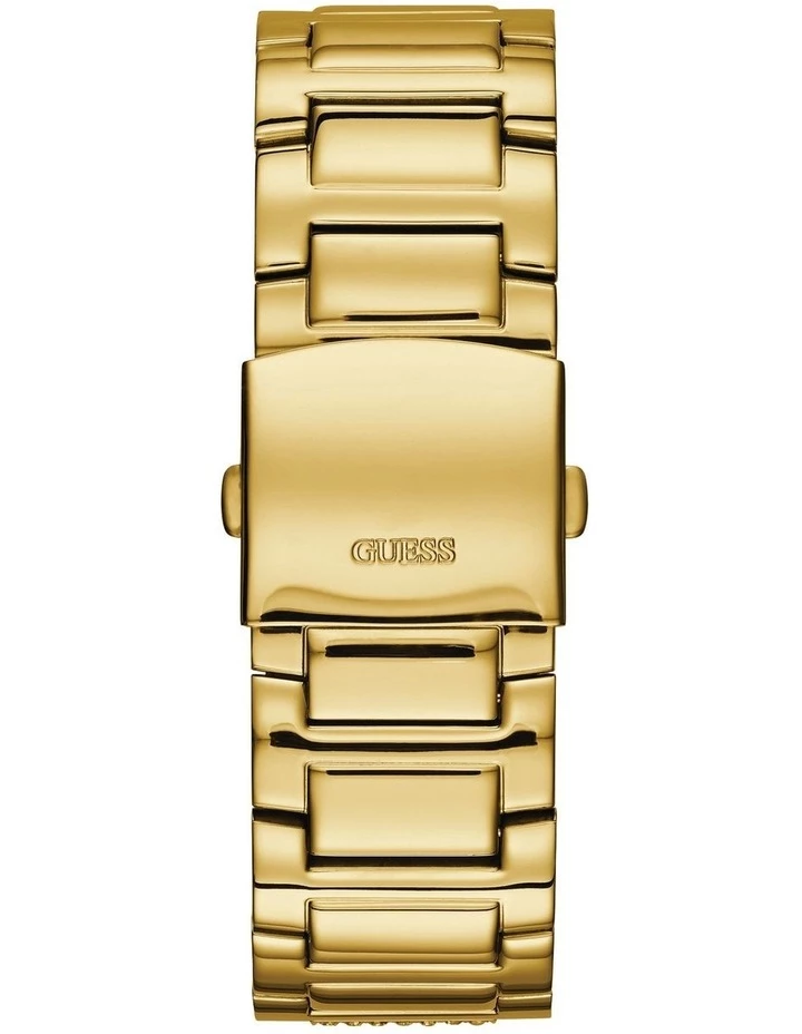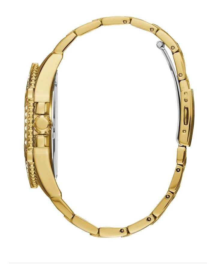 Be noticed with this eye-catching new style from GUESS. The yellow gold plated stainless steel case and bracelet encrusted with 162 crystals is guaranteed to make you stand out from the crowd.