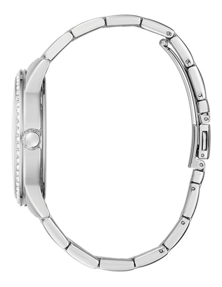 The Guess Ladies G Check watch is iconically GUESS featuring a logo dial with Swarovski markers in a silver tone 40mm case.