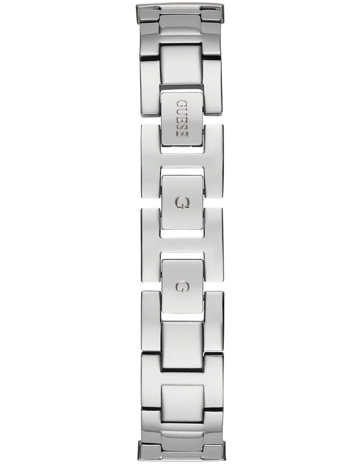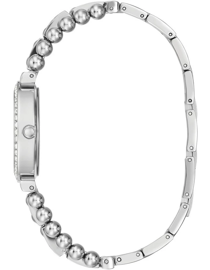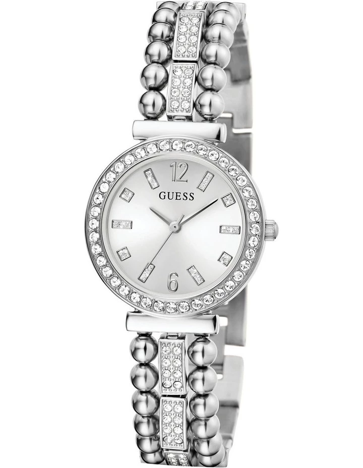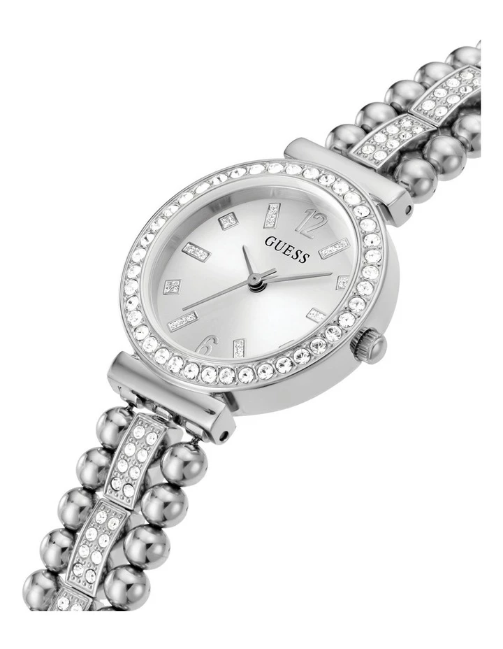 Get Gala ready with this jewellery statement watch by Guess. This fashion accessory timepiece features an all over silver glitz stone & ball link bracelet which is enriched with a crystal bezel and stone accents on a shimmering dial.