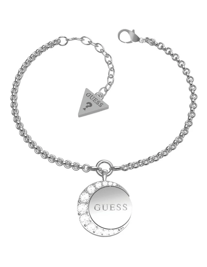 Inspired by the night sky, the GUESS Jewellery bracelet from the Moon Phases collection in silver tone features a single chain and turning coin charm with crystal embellishments.
