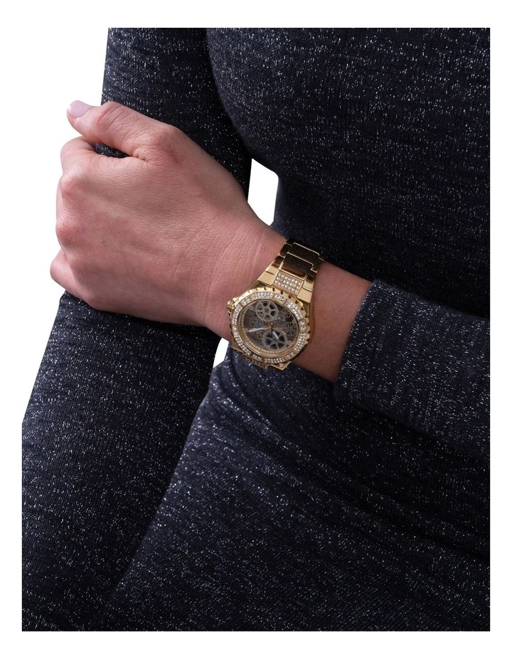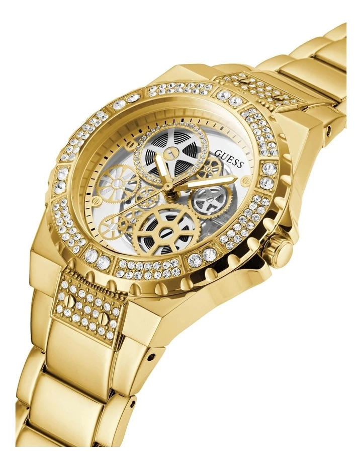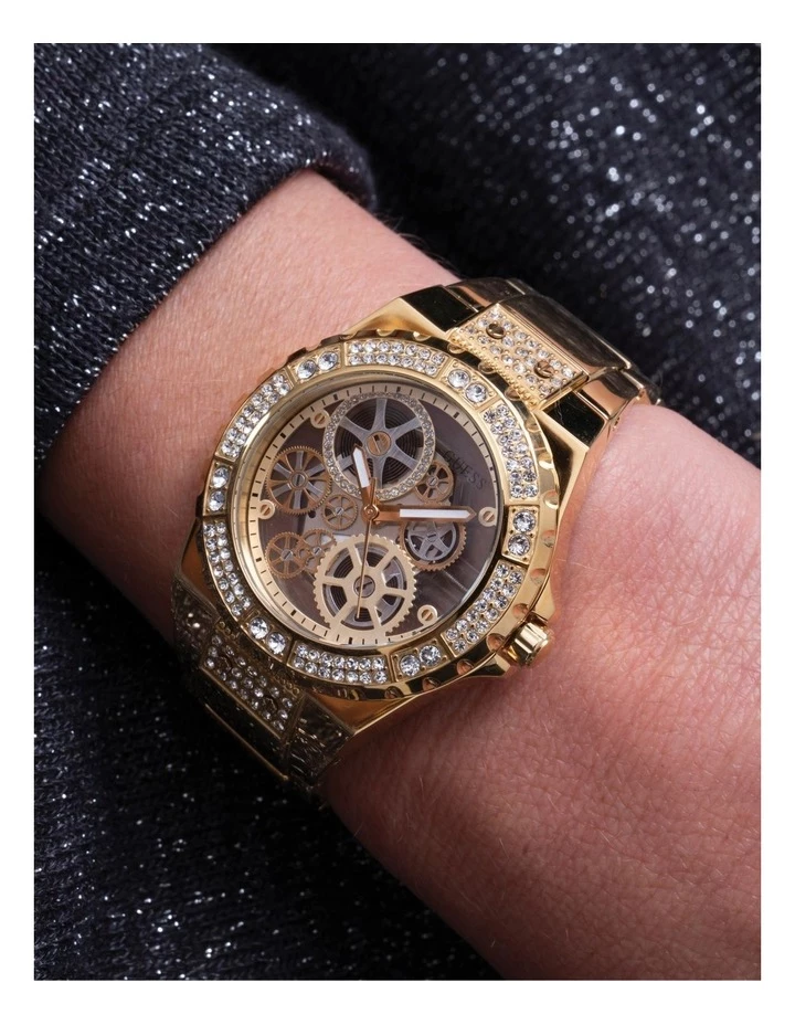 Elevate your night out with this perfect Guess Reveal Watch. This Timepiece sports a gold case with a champagne coloured dial.