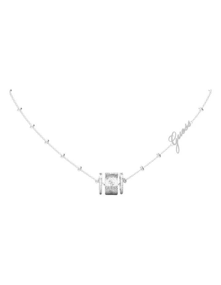 Simple yet elegant, the GUESS Jewellery necklace from the Round Harmony collection in silver tone features a round band pendant with 4G logo pattern and crystal embellishments with GUESS word logo placement on the chain.