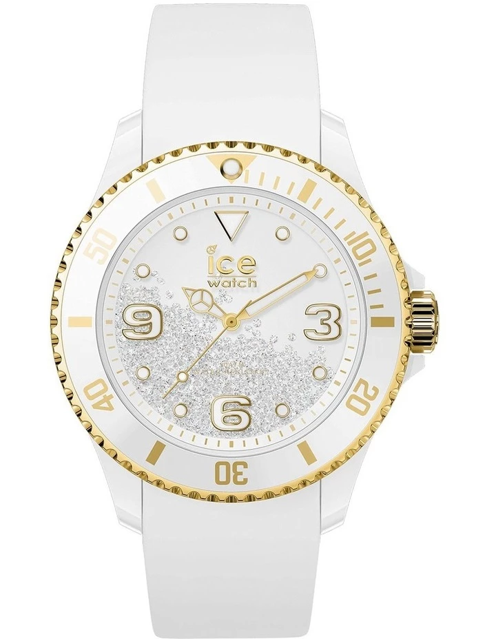 With the launch of the ICE crystal collection, chic sophistication blends impeccably with flagship Ice-Watch design. This medium-sized white watch features a transparent dial with gold details, encasing a cascade of 400 crystals that spin and swirl freely with your every movement. Mesmerising, shimmering and incredibly elegant, the ICE crystal watch combines steel details with a silicon bracelet for a wonderfully stylish look!