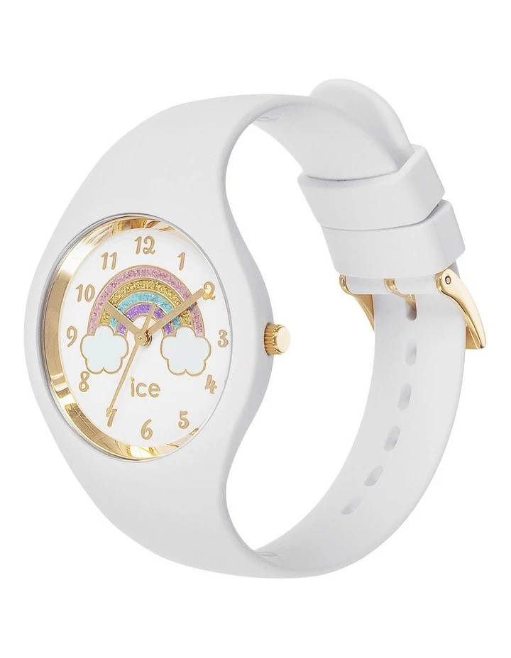 Enjoy a rainbow of fun with the ICE fantasia rainbow white watch a feminine, girly model that will dazzle fans of glitter and sparkle of all ages! Featuring a super soft silicone strap, this cute, charming white watch will be a hit with little (and big!) princesses. You will simply love the gold details and glittery colourful rainbow.