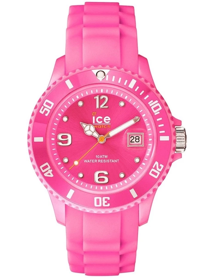 It is a pink silicone watch. Its dial is also pink. Its hands and the hour markers are white. This small version is perfect for women and children.