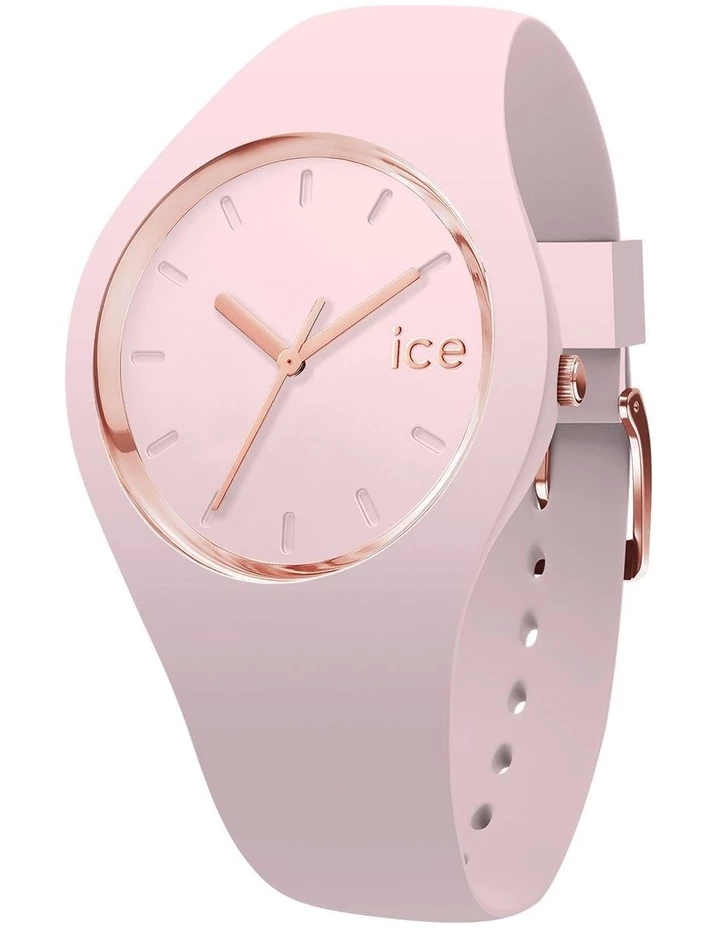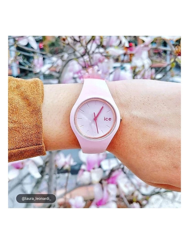 It is an extra flat silicone watch. Its dial and its strap are pastel pink. Its hands and the edge of the dial are gold.