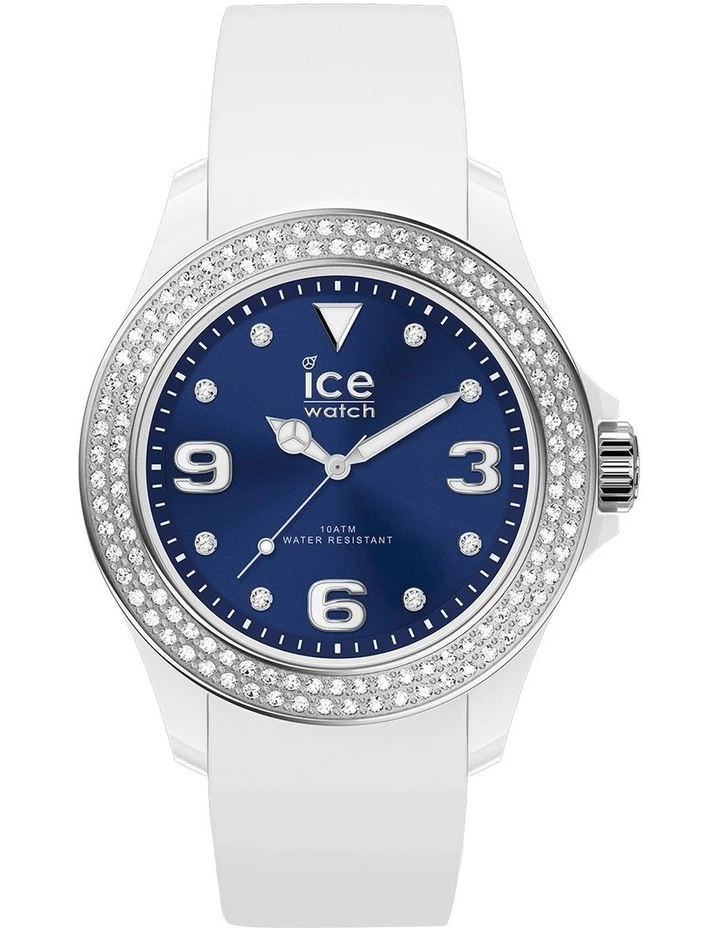 You will simply love the shimmering lustre of the ICE star white deep blue smooth watch! This small white timepiece, featuring a dial with silver details studded with sparkling crystals, will brighten up your wrist for a sophisticated look. It is radiant, feminine and incredibly chic, with a captivating glossy deep midnight blue dial.