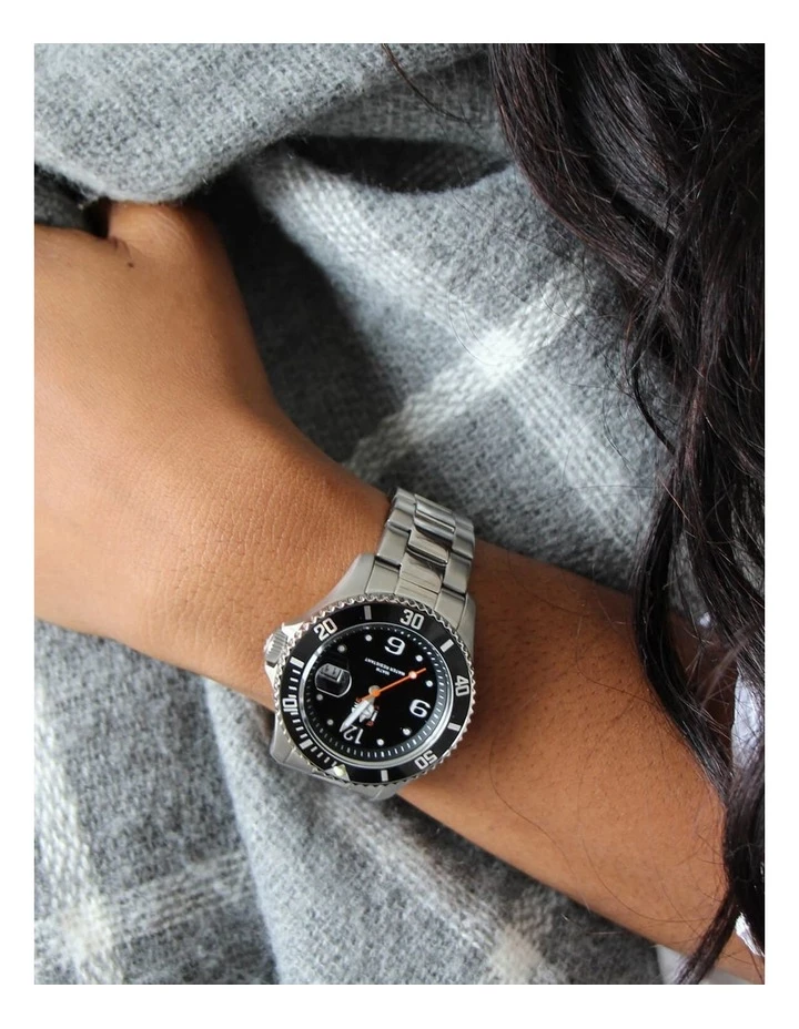 This masculine and robust steel watch gives a unique style to your everyday outfits. Thanks to its deep black dial with red and silver details and its metal link wrist strap, this watch will embellish your wrist with a modern masculine touch.