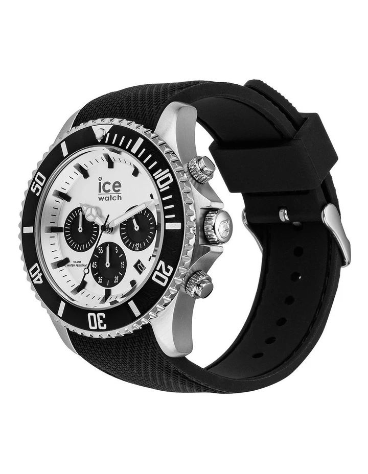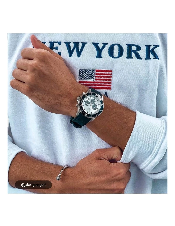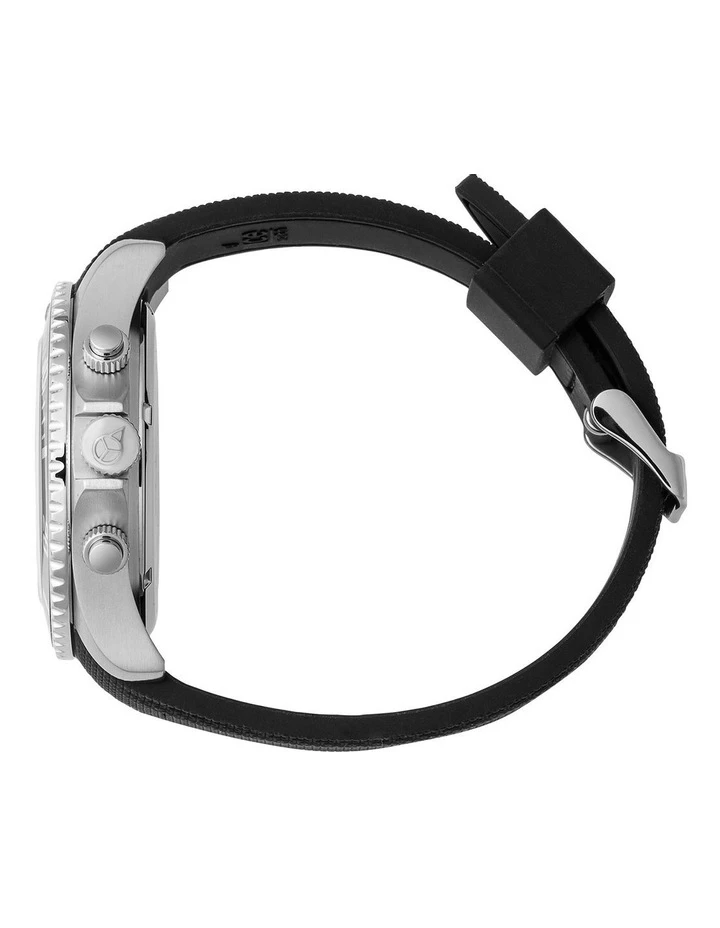 Masculine and robust, this black watch with silver details provides effortless everyday style to achieve a modern look. With its deep black dial and steel details, stopwatch and silicone strap, this watch will add a sophisticated touch to your wrist.