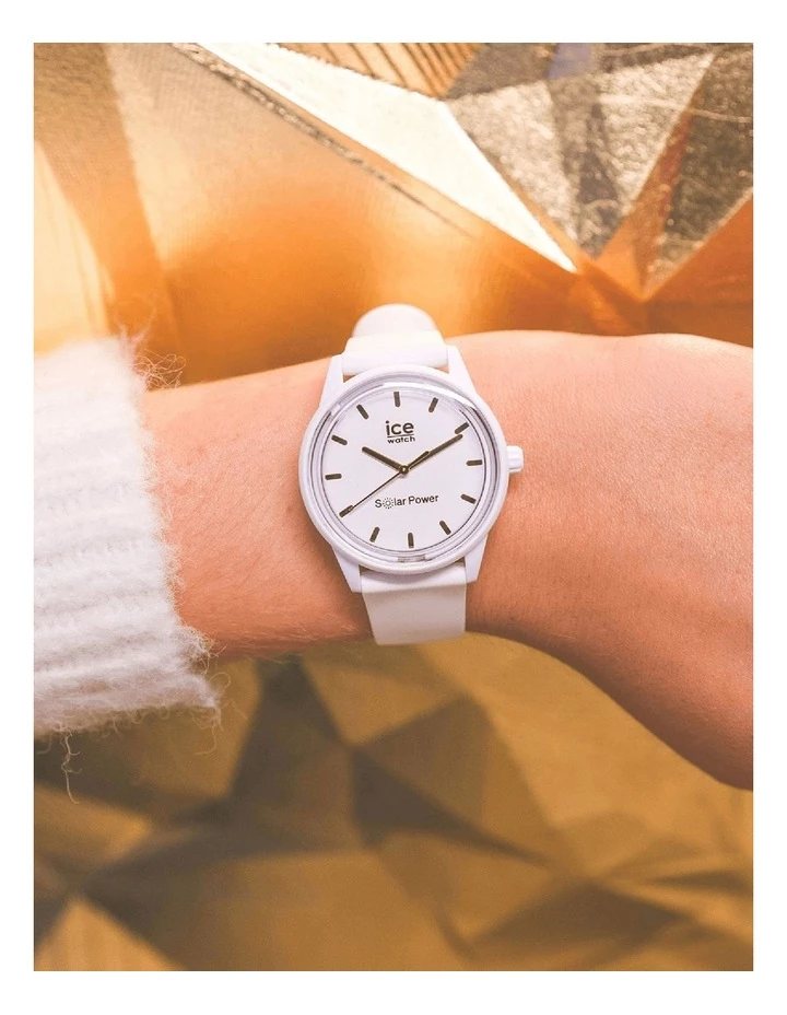 Go green and do your bit for the planet with the new ICE solar power white gold watch. The small white solar-powered timepiece is ultra slim and feather light. Made from super soft silicone and featuring a sleek dial, this elegant model is the ultimate minimalist statement. You will love the chic, sophisticated gold details. Simply expose it to natural or artificial light to charge, then sit back and enjoy as it lasts and lasts! It comes in a reusable felt pouch made from recycled plastic bottles.