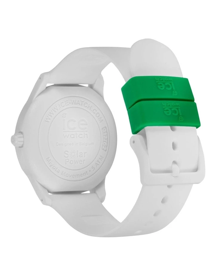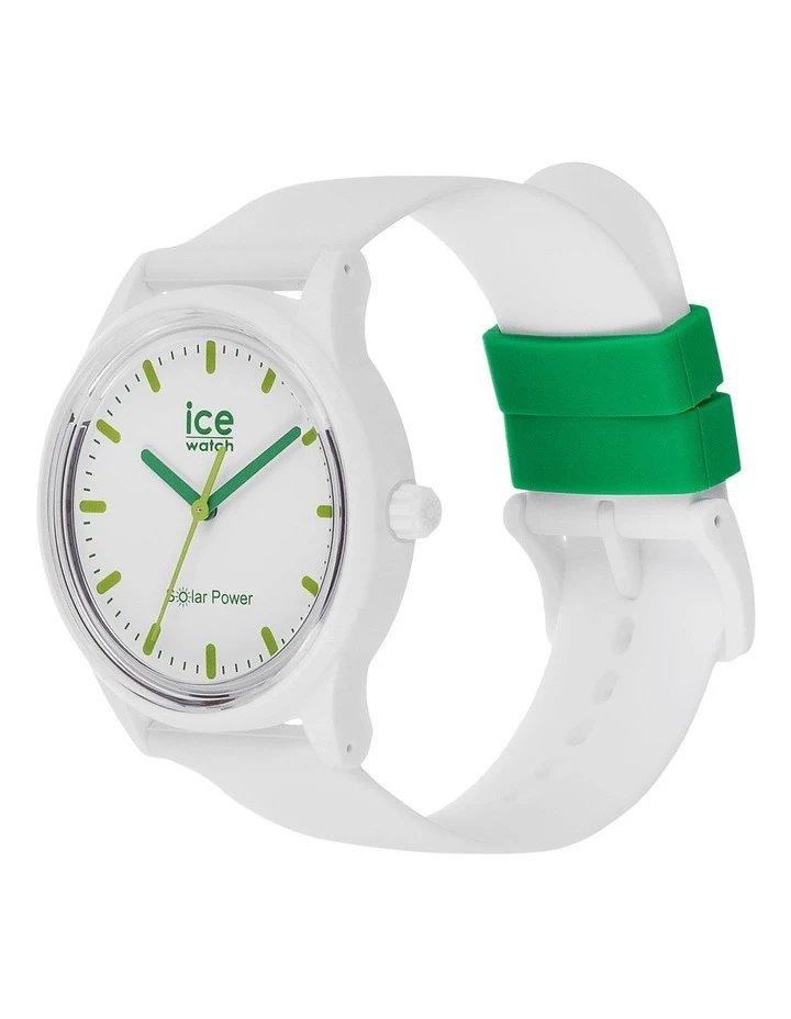 Go green and do your bit for the planet with the new ICE solar power nature watch. The white solar-powered timepiece is ultra slim and feather light. Made from super soft silicone and featuring a sleek dial, this unisex model is the ultimate minimalist statement. Its pure green details evoke the natural world. Simply expose it to natural or artificial light to charge, then sit back and enjoy as it lasts and lasts! It comes in a reusable felt pouch made from recycled plastic bottles.