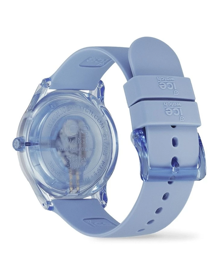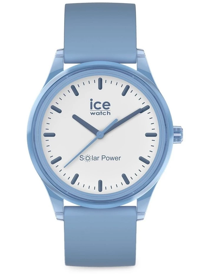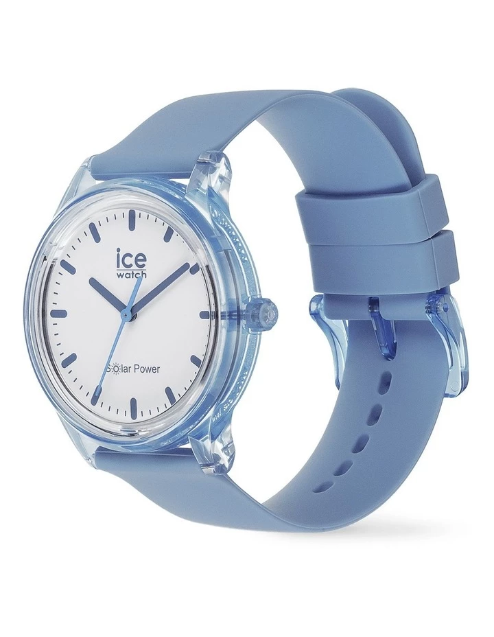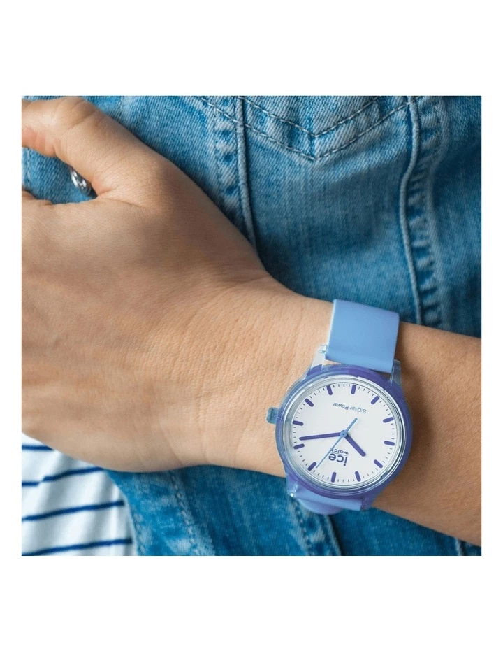 Go green and do your bit for the planet with the new ICE solar power rain watch. The sky blue solar-powered timepiece is ultra slim and feather light. Made from super soft silicone and featuring a sleek white dial, this unisex model is the ultimate minimalist statement. Simply expose it to natural or artificial light to charge, then sit back and enjoy as it lasts and lasts! It comes in a reusable felt pouch made from recycled plastic bottles.