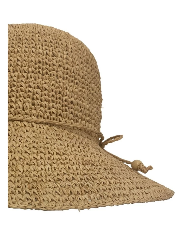 A raffia straw crochet bucket hat, featuring a twisted raffia braid around crown and a bow with wooden beads. A beautifully crafted hat made from sustainably harvested Madagascan raffia.