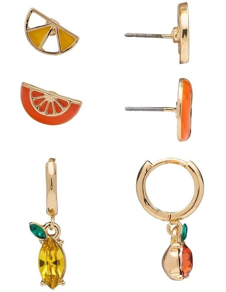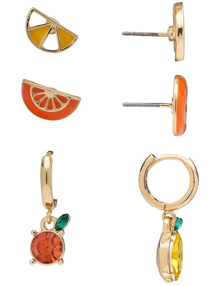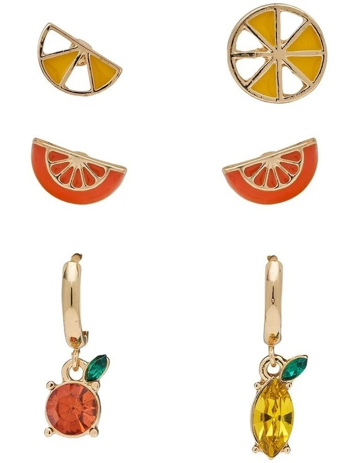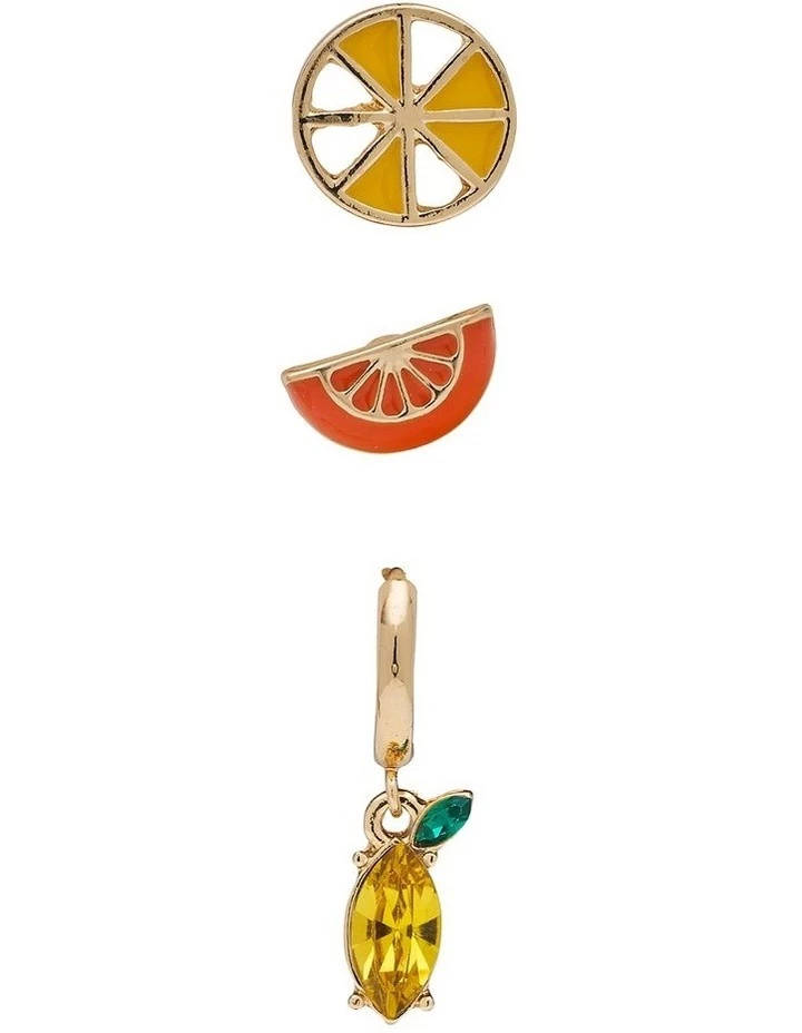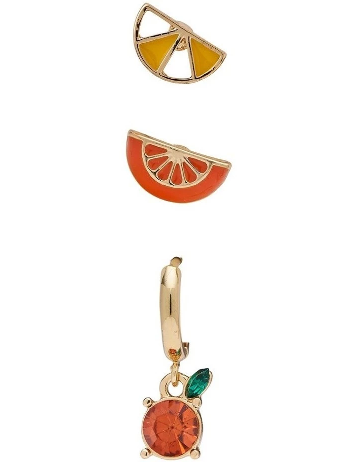 Marcs captures spirited design, colour and vibrant charactercreating timeless classics and expressive statement pieces to add individualityand confidence to both work and weekend. Add a fresh pop of colour to yoursummer style with the Citrus Medley Multi Pack Earrings. This fun and fruityearring set feature lemon and orange studs with gold-coloured plating andcolourful enamel, and hoop earrings with sparkling stone drops.
