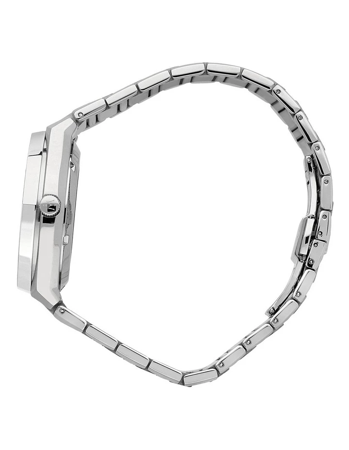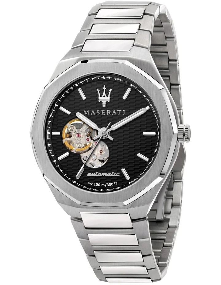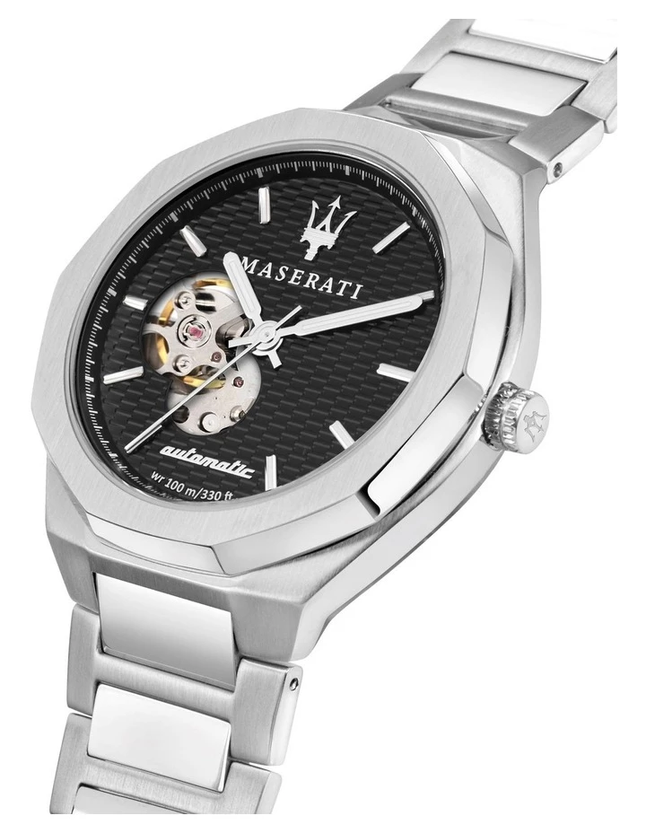 Presenting the Maserati Stile Silver Automatic Watch. Welcome to the Maserati Stile Collection: watches that take up the mechanics, construction and stylistic codes of the iconic sporting watchmaking timepieces. The decisive lines, the distinctive decagonal bezel and theslim case are combined with details that strongly identify the sportingworld such as: pump pushers, screw-down crown, multi-level dial, appliedluminescent indexes, luminescent hands and a buckle with a personalisedbutterfly clasp featuring the applied Trident.